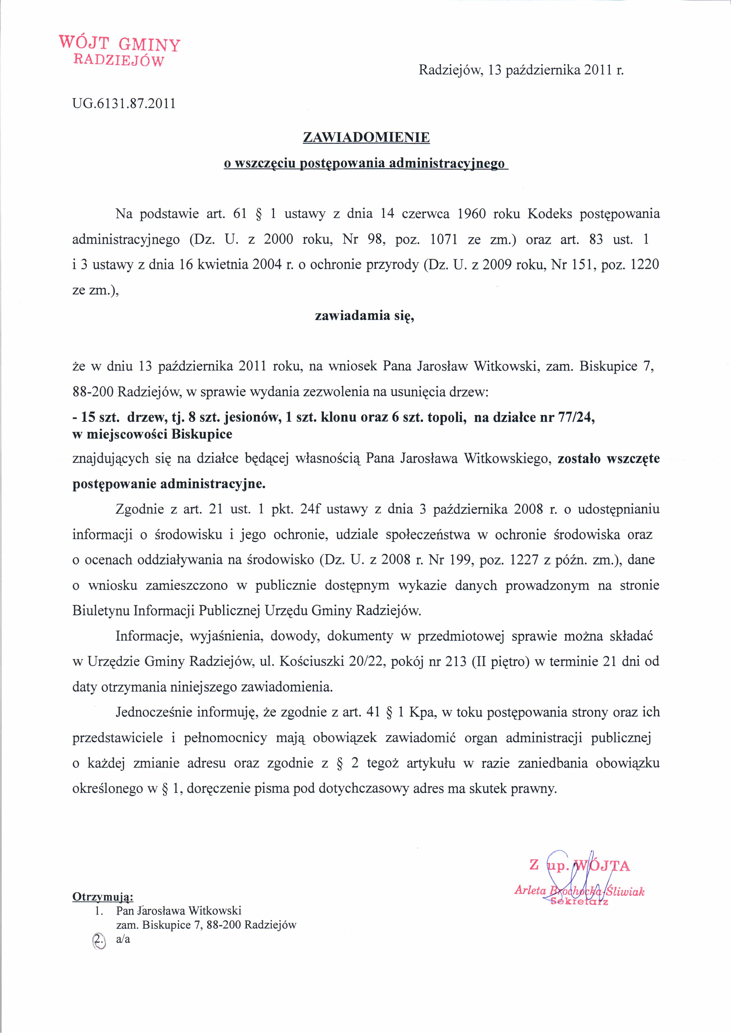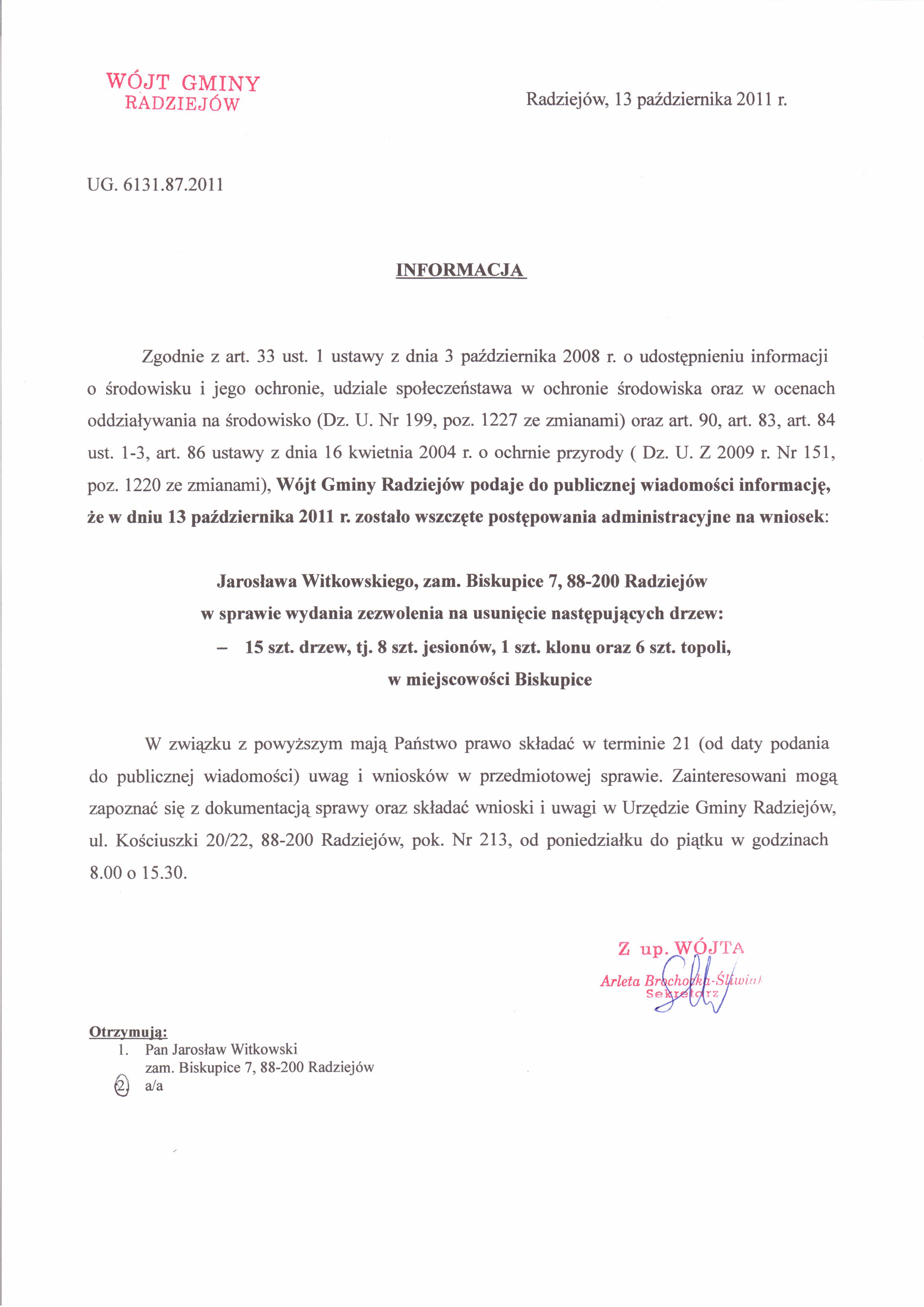 | Zgodnie z art. 21 pkt 1 i 2 ust臋p 24 litera f,ustawy z dnia 3 pa藕dziernika 2008 roku o udost臋pnieniu informacji o 艣rodowisku i jego ochronie, udziale spo艂ecze艅stwa w ochronie 艣rodowiska oraz ocenach oddzia艂ywania na 艣rodowisko (Dz.U.z 2008 r. Nr 199 poz.1227) oraz art. 83 ust. 1 i 3 ustawy z dnia 16 kwietnia 2004 roku o ochronie przyrody (Dz. U. z 2009 r. Nr 151, poz. 1220 ze zmianami) W贸jt Gminy Radziej贸w podaje do publicznej wiadomo艣ci informacj臋, 偶e w dniu 13 pa藕dziernika 2011 r. zosta艂o wszcz臋te post臋powanie administracyjne na wniosek:
