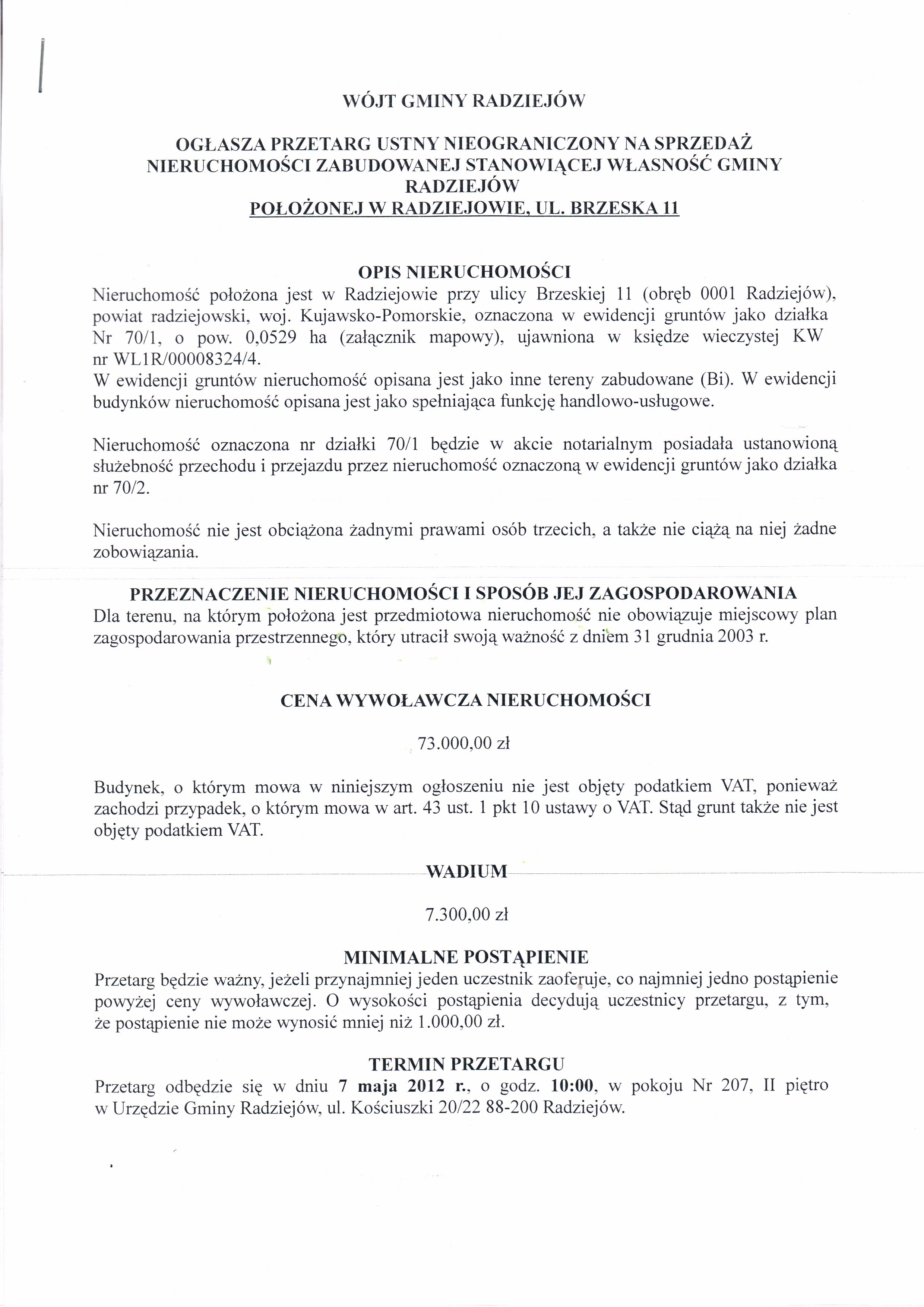 Og艂oszenie o przetargu ustnym nieograniczonym na sprzeda偶 nieruchomo艣ci gruntowej zabudowanej stanowi膮cej w艂asno艣膰 Gminy Radziej贸w po艂o偶onej przy ul. Brzeskiej 11 w Radziejowie oznaczonej w ewidencji grunt贸w jako dzia艂ka Nr 70/1, o pow. 0,0529 ha, ujawnionej w ksi臋dze wieczystej KW WL1R/00008324/4.