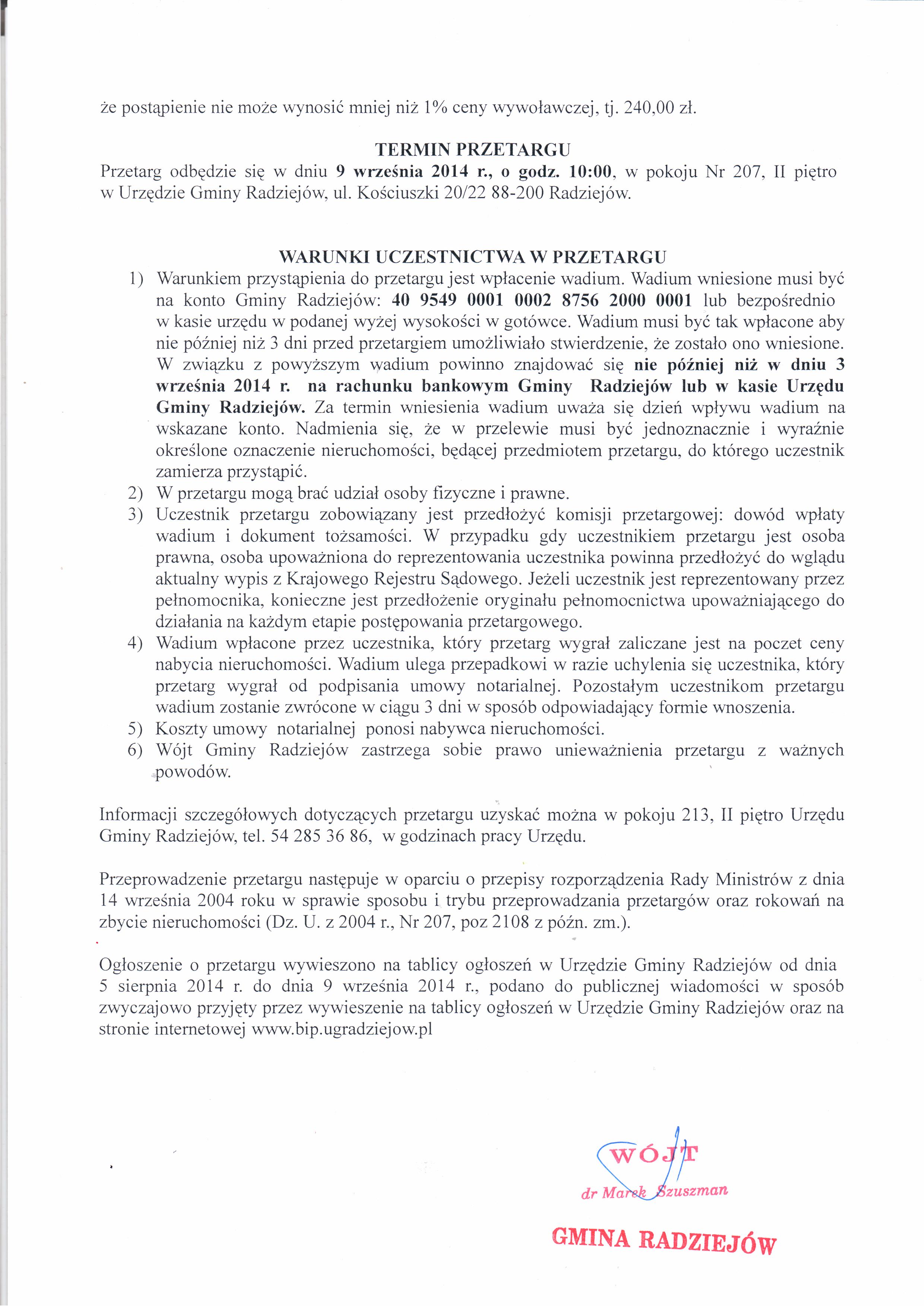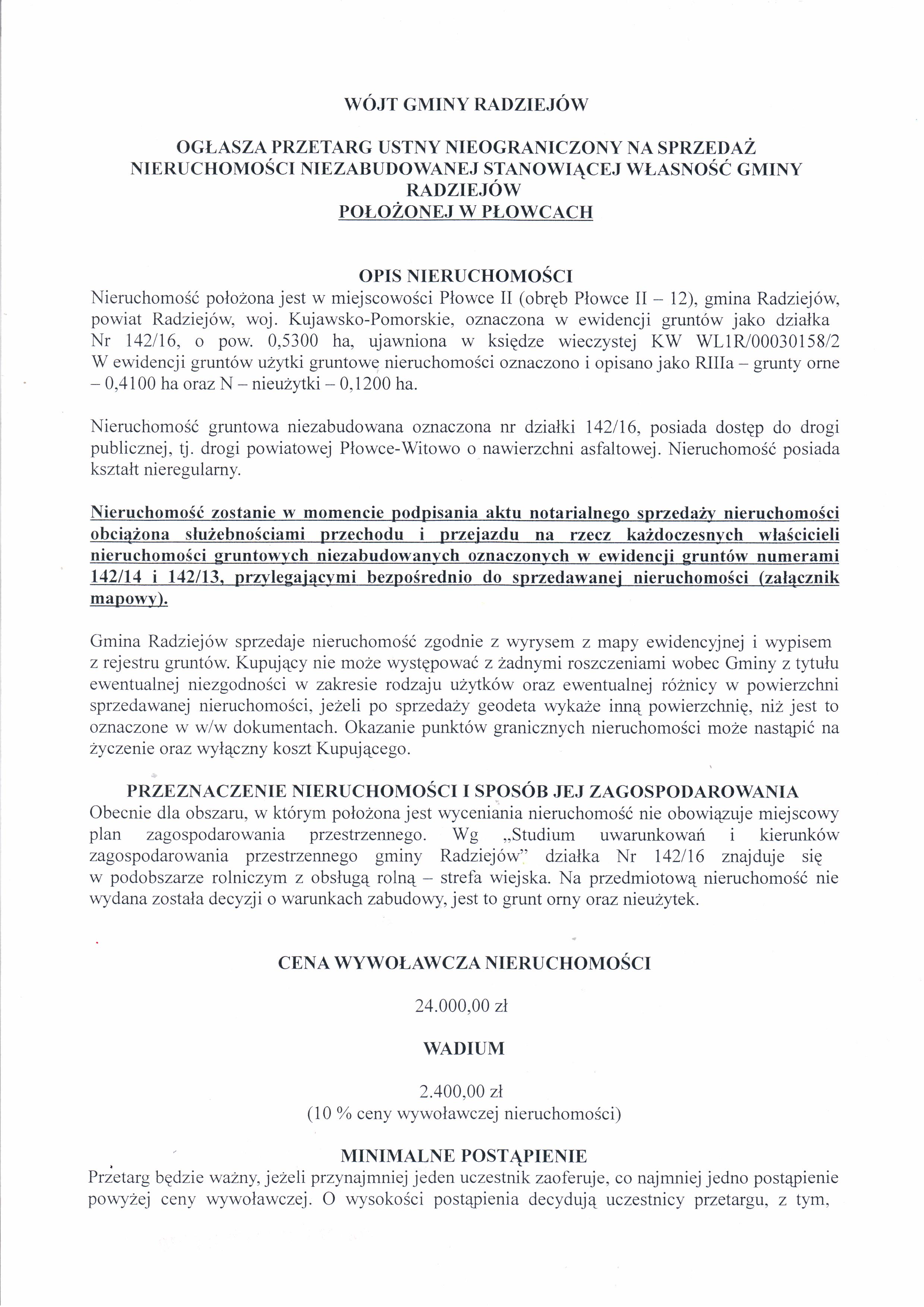 Og艂oszenie o przetargu ustnym nieograniczonym na sprzeda偶 nieruchomo艣ci gruntowej niezabudowanej po艂o偶onej w m. P艂owce II, dzia艂ka Nr 142/16.