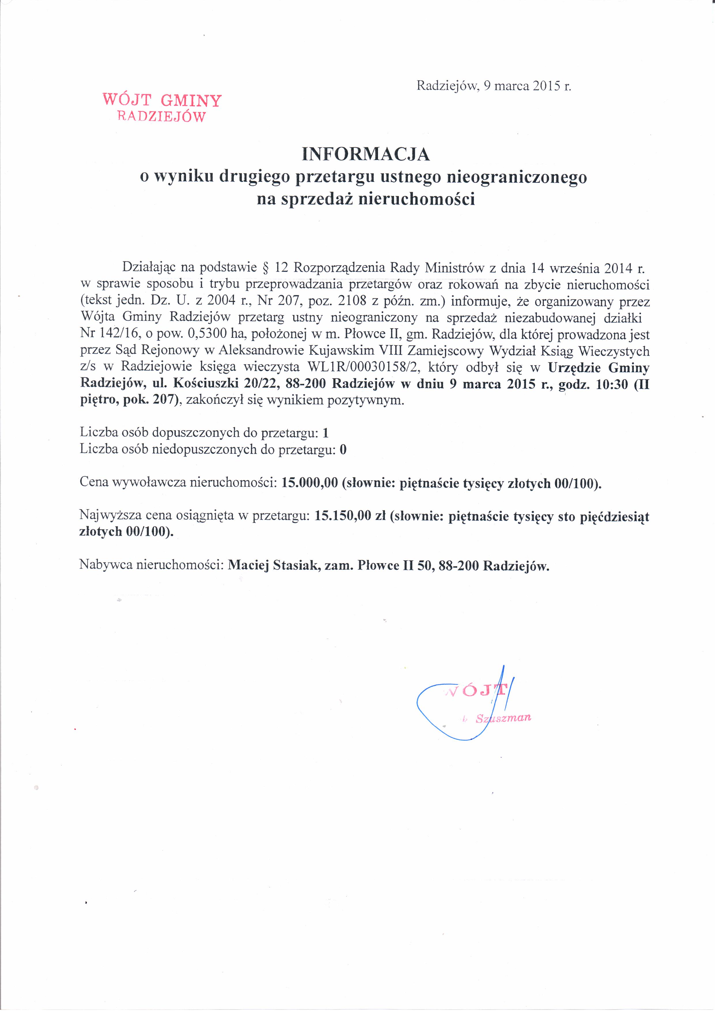Og艂oszenie o drugim przetargu ustnym nieograniczonym na sprzeda偶 nieruchomo艣ci gruntowej niezabudowanej po艂o偶onej w miejscowo艣ci P艂owce II, gm. Radziej贸w, oznaczonej w ewidencji grunt贸w numerem 142/16, o powierzchni 0,5300 ha (w tym 0,4100 ha rola klasy IIIa oraz 0,1200 ha nieu偶ytek).
