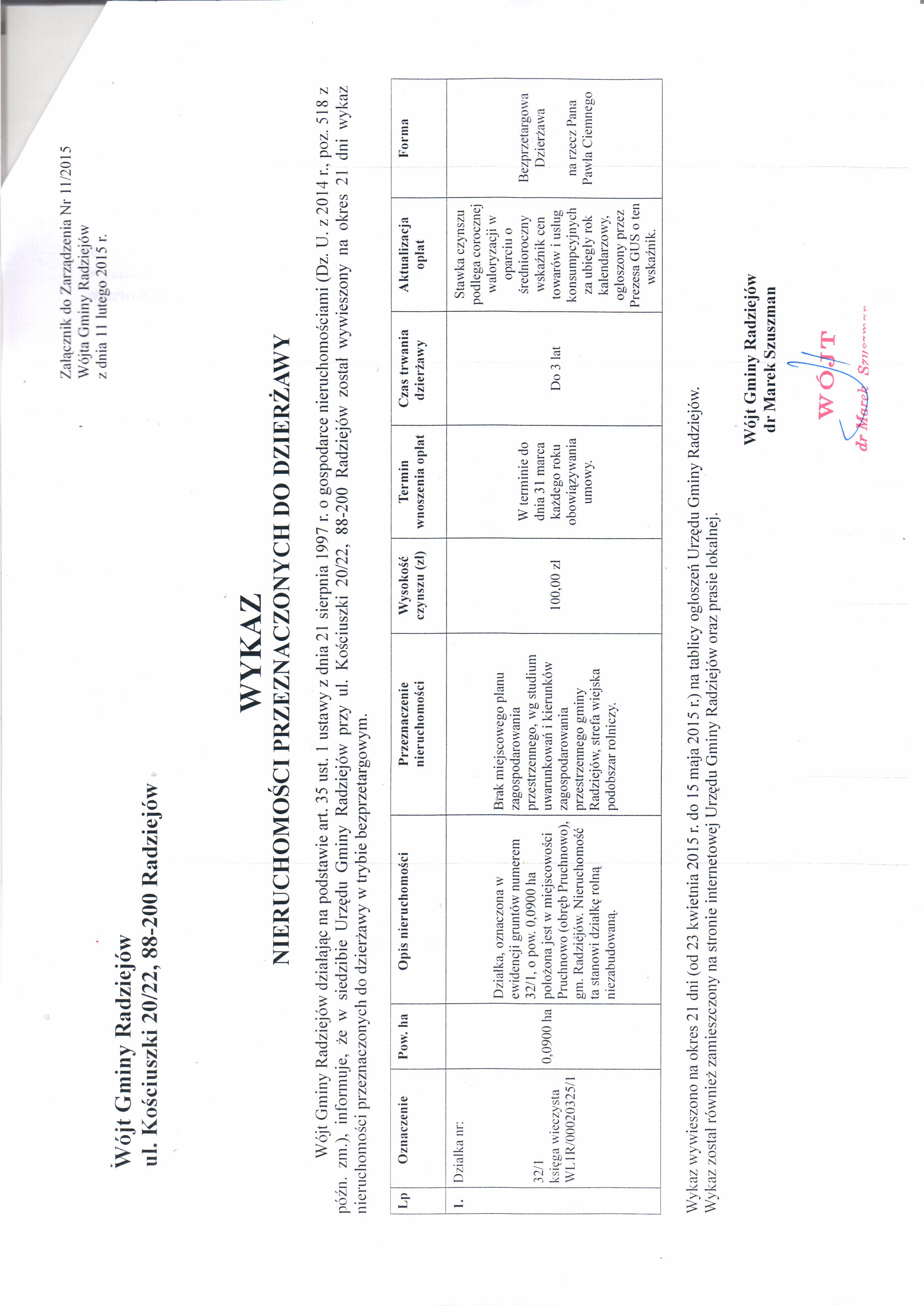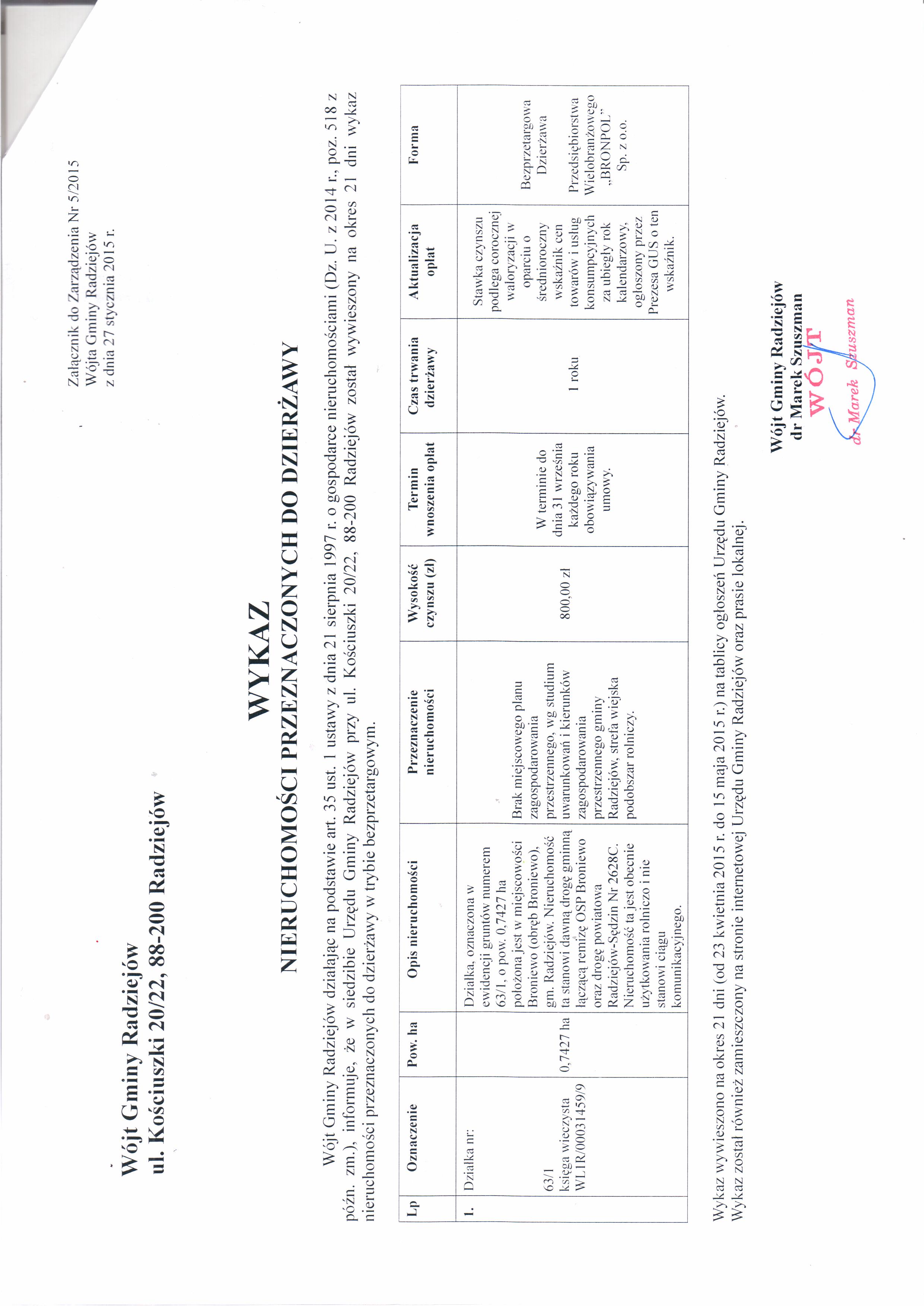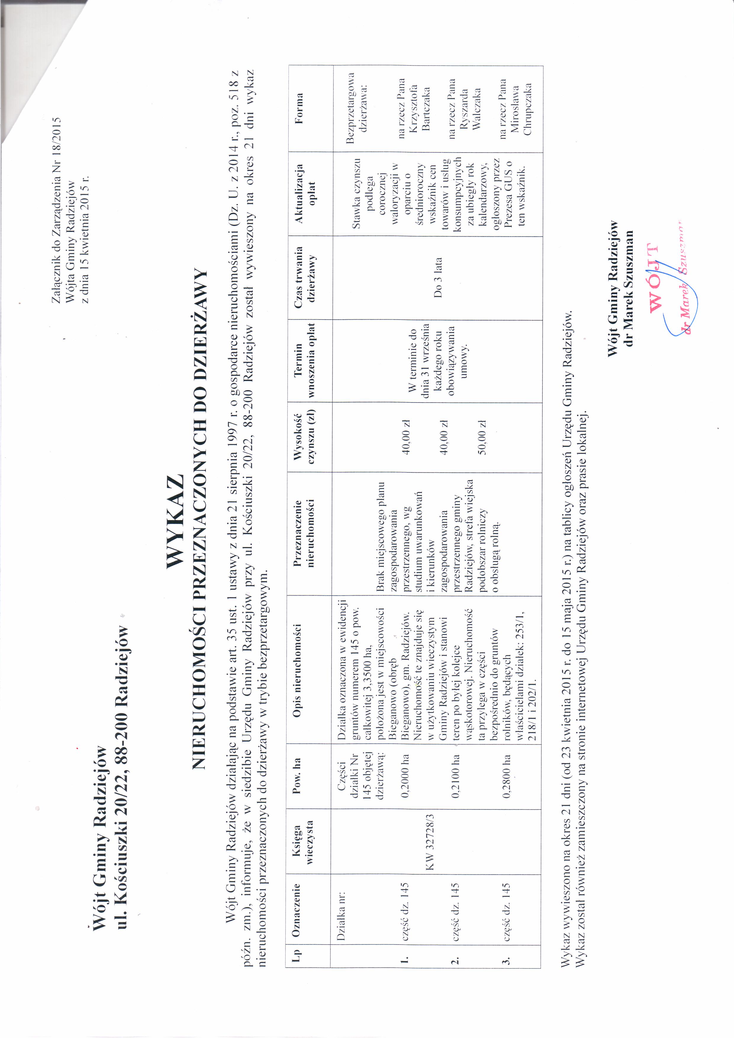 Wykaz nieruchomo艣ci przeznaczonych do dzier偶awy i u偶yczenia w drodze bezprzetargowej, tj. dzia艂ki Nr: 32/1, o pow. 0,0900 ha, po艂o偶ona w miejscowo艣ci Pruchnowo, na rzecz Pana Paw艂a Ciemnego; 63/1, pow. 0,7427 ha, po艂o偶ona w miejscowo艣ci Broniewo, na rzecz P.W. "BRONPOL" Sp. z o.o.; 76/19, pow. 0,2535 ha, po艂o偶ona w miejscowo艣ci Broniewo, na rzecz P.W. "BRONPOL" Sp. z o.o.; cz臋艣膰 dzia艂ki 145, pow. ca艂kowita 3,3500 ha, po艂o偶ona w miejscowo艣ci Bieganowo, na rzecz Pan贸w Ryszarda Walczaka, Miros艂awa Chrupczaka i Krzysztofa Bartczaka.