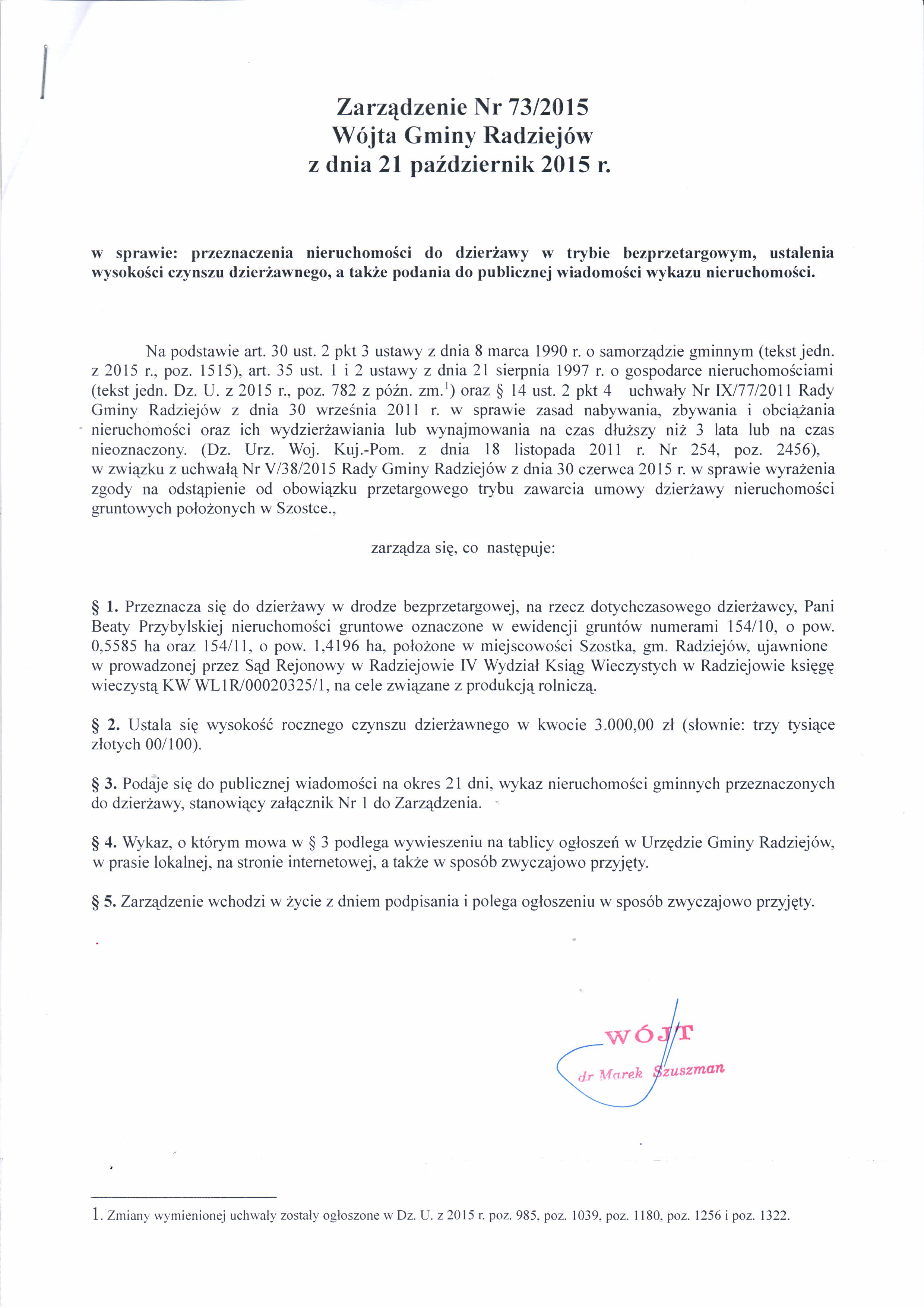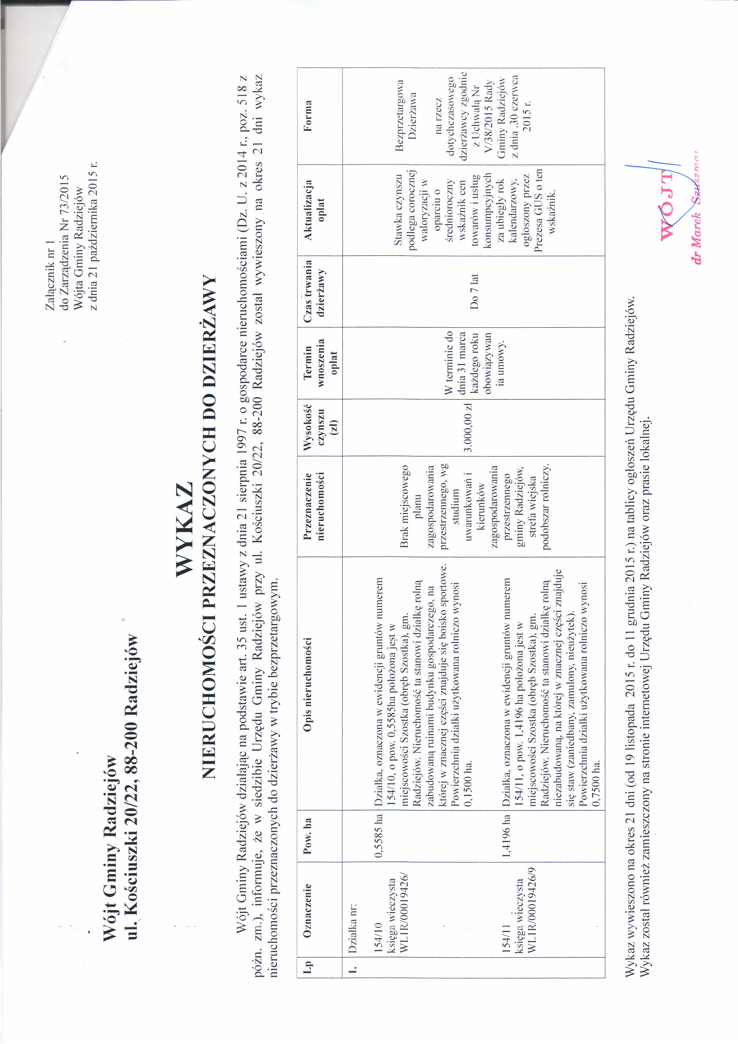 Wykaz nieruchomo艣ci,tj. dzia艂ki nr 154/10 i dzia艂ki nr 154/11 po艂o偶onych w miejscowo艣ci Szostka, gm. Radziej贸w, przeznaczonych do dzier偶awy w drodze bezprzetargowej na podstawie Uchwa艂y Nr V/38/2015 Rady Gminy Radziej贸w z dnia 30 czerwca 2015 r.