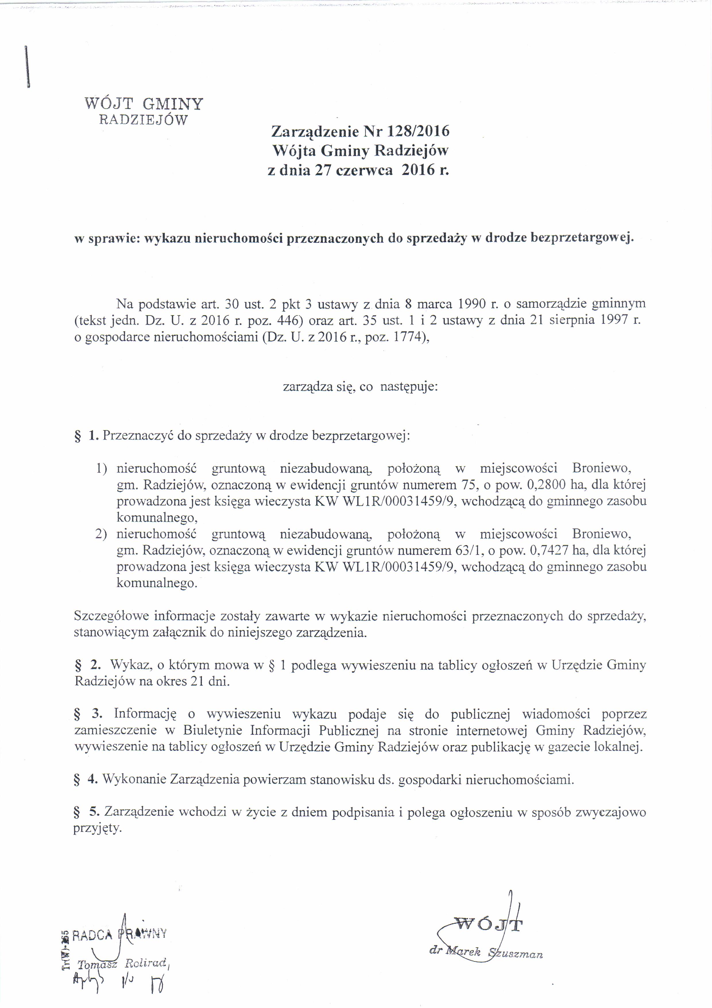 Wykaz nieruchomo艣ci,tj. dzia艂ki nr 63/1 i dzia艂ki nr 75 po艂o偶onych w miejscowo艣ci Broniewo, gm. Radziej贸w, przeznaczonych do sprzeda偶y w trybie bezprzetargowym.