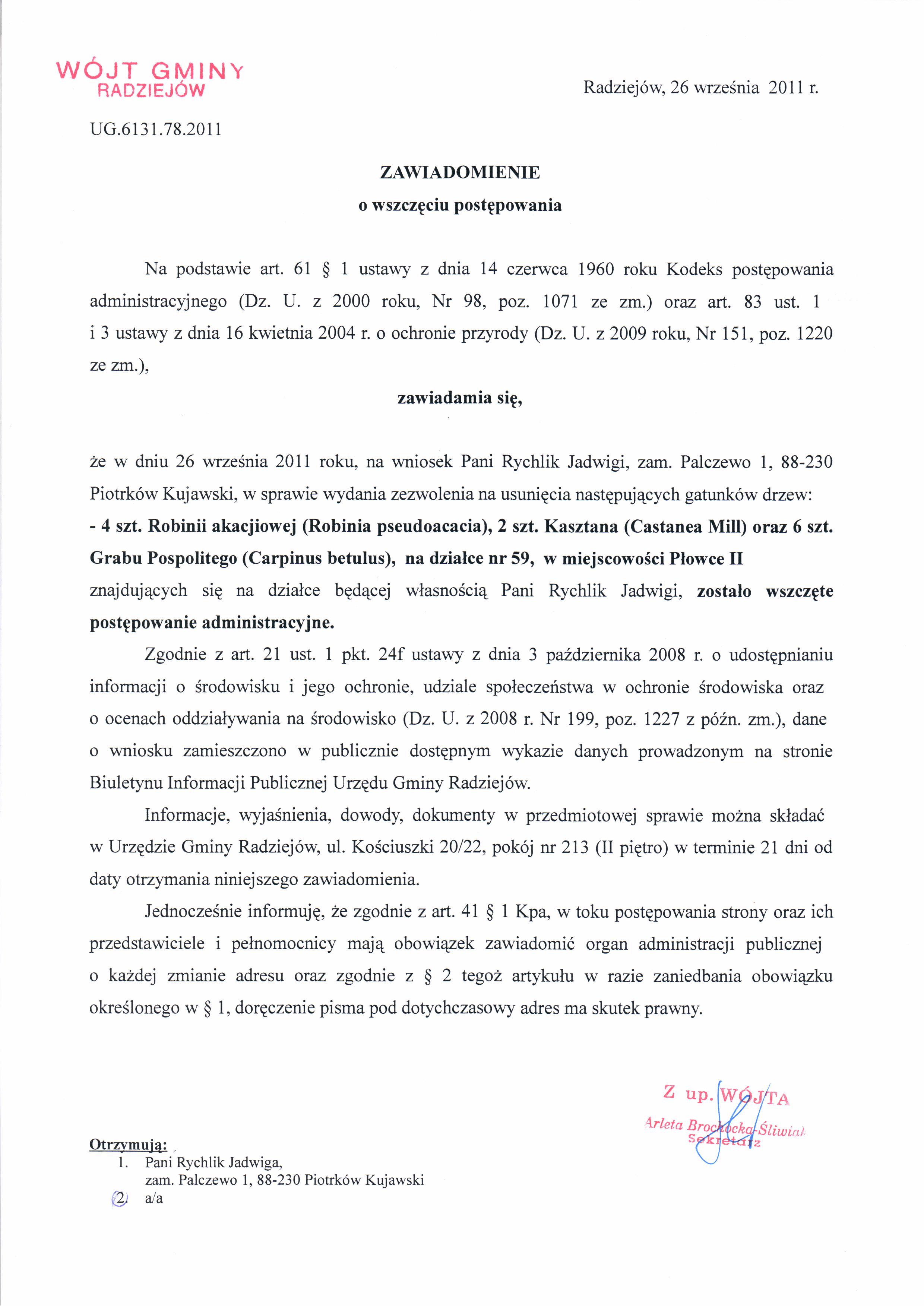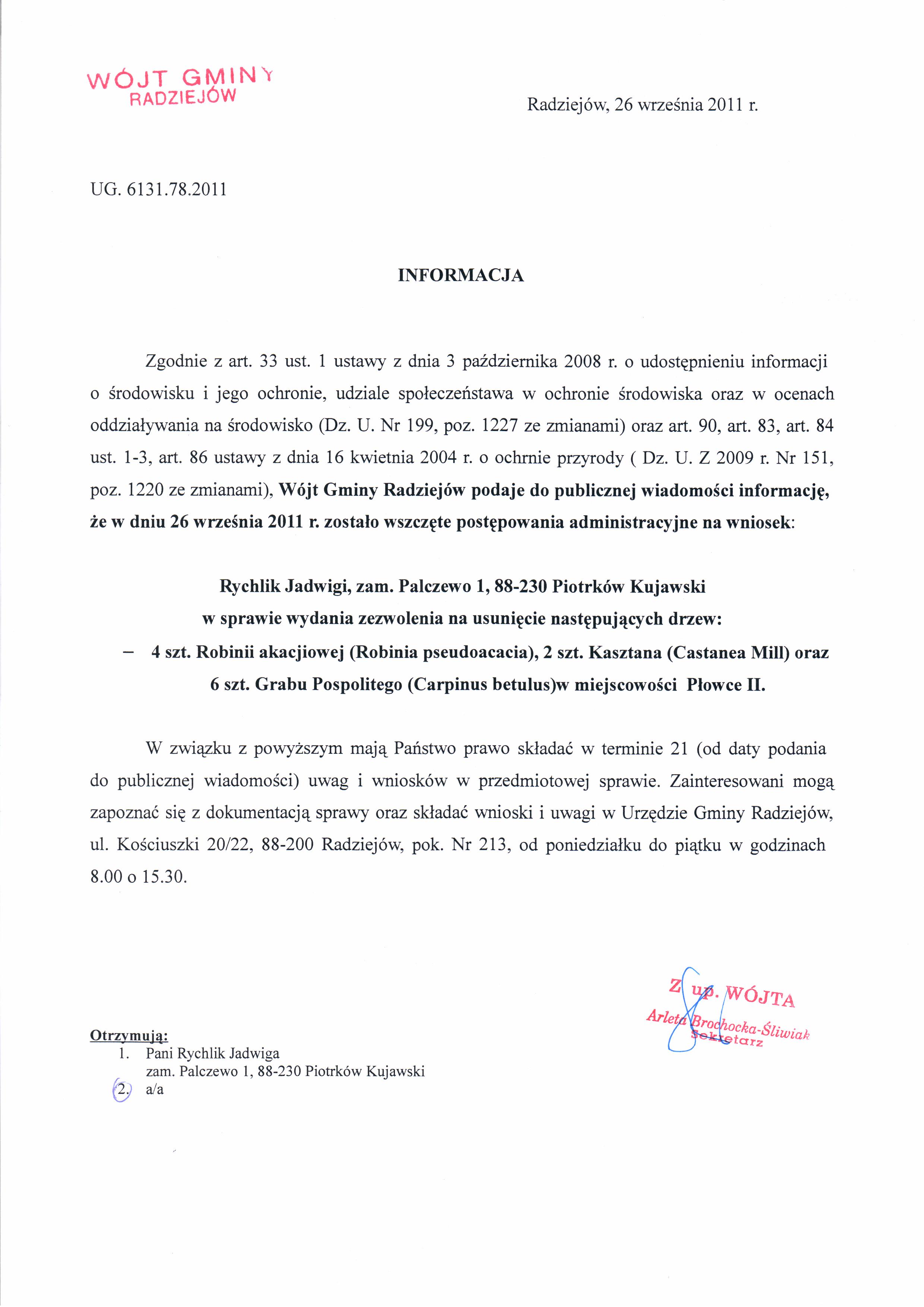 | Zgodnie z art. 21 pkt 1 i 2 ust臋p 24 litera f,ustawy z dnia 3 pa藕dziernika 2008 roku o udost臋pnieniu informacji o 艣rodowisku i jego ochronie, udziale spo艂ecze艅stwa w ochronie 艣rodowiska oraz ocenach oddzia艂ywania na 艣rodowisko (Dz.U.z 2008 r. Nr 199 poz.1227) oraz art. 83 ust. 1 i 3 ustawy z dnia 16 kwietnia 2004 roku o ochronie przyrody (Dz. U. z 2009 r. Nr 151, poz. 1220 ze zmianami) W贸jt Gminy Radziej贸w podaje do publicznej wiadomo艣ci informacj臋, 偶e w dniu 26 wrze艣nia 2011 r. zosta艂o wszcz臋te post臋powanie administracyjne na wniosek: