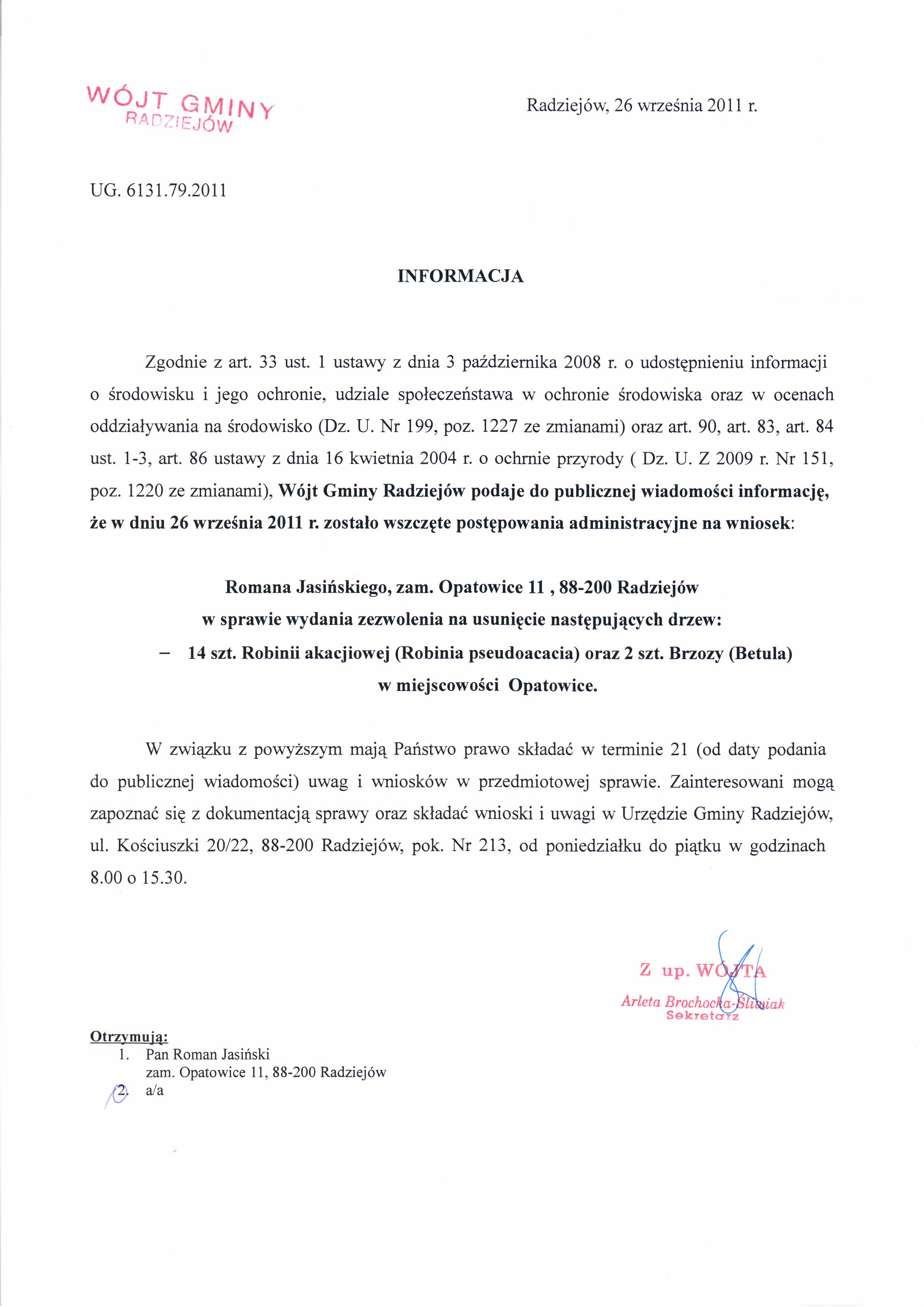 Pana Romana Jasi艅skiego, zam. Opatowice 11, 88-200 Radziej贸w w sprawie wydania decyzji zezwalaj膮cej na usuni臋cie 14 szt.Robinii Akacjowej (Robinia pseudoacacia) oraz 2 szt. Brz贸z (Betula) rosn膮cych na gruntach b臋d膮cych jej w艂asno艣ci膮.