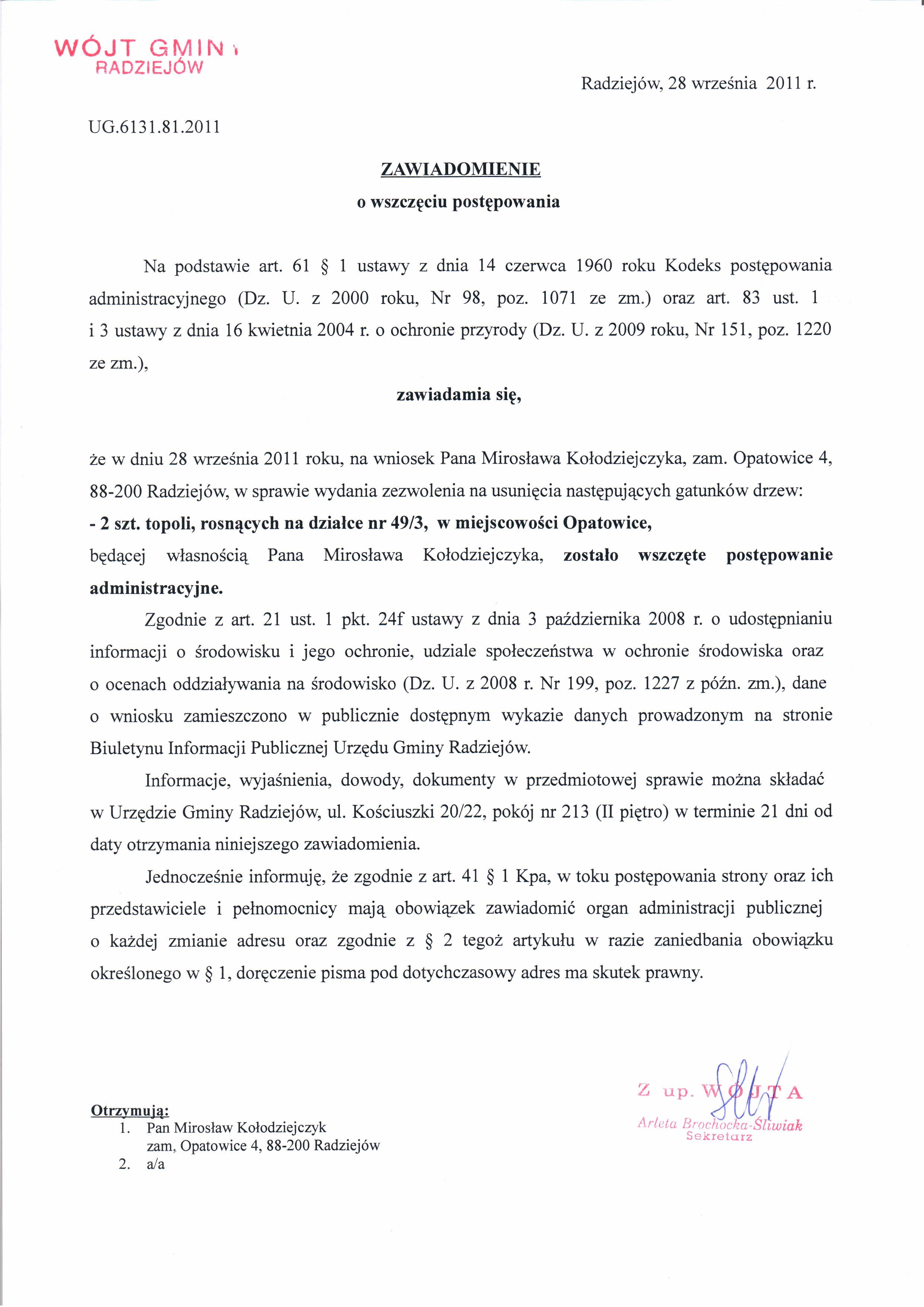 Pana Miros艂awa Ko艂odziejczyka, zam. Opatowice 4, 88-200 Radziej贸w w sprawie wydania decyzji zezwalaj膮cej na usuni臋cie 2 szt. topoli rosn膮cych na gruntach b臋d膮cych jej w艂asno艣ci膮.