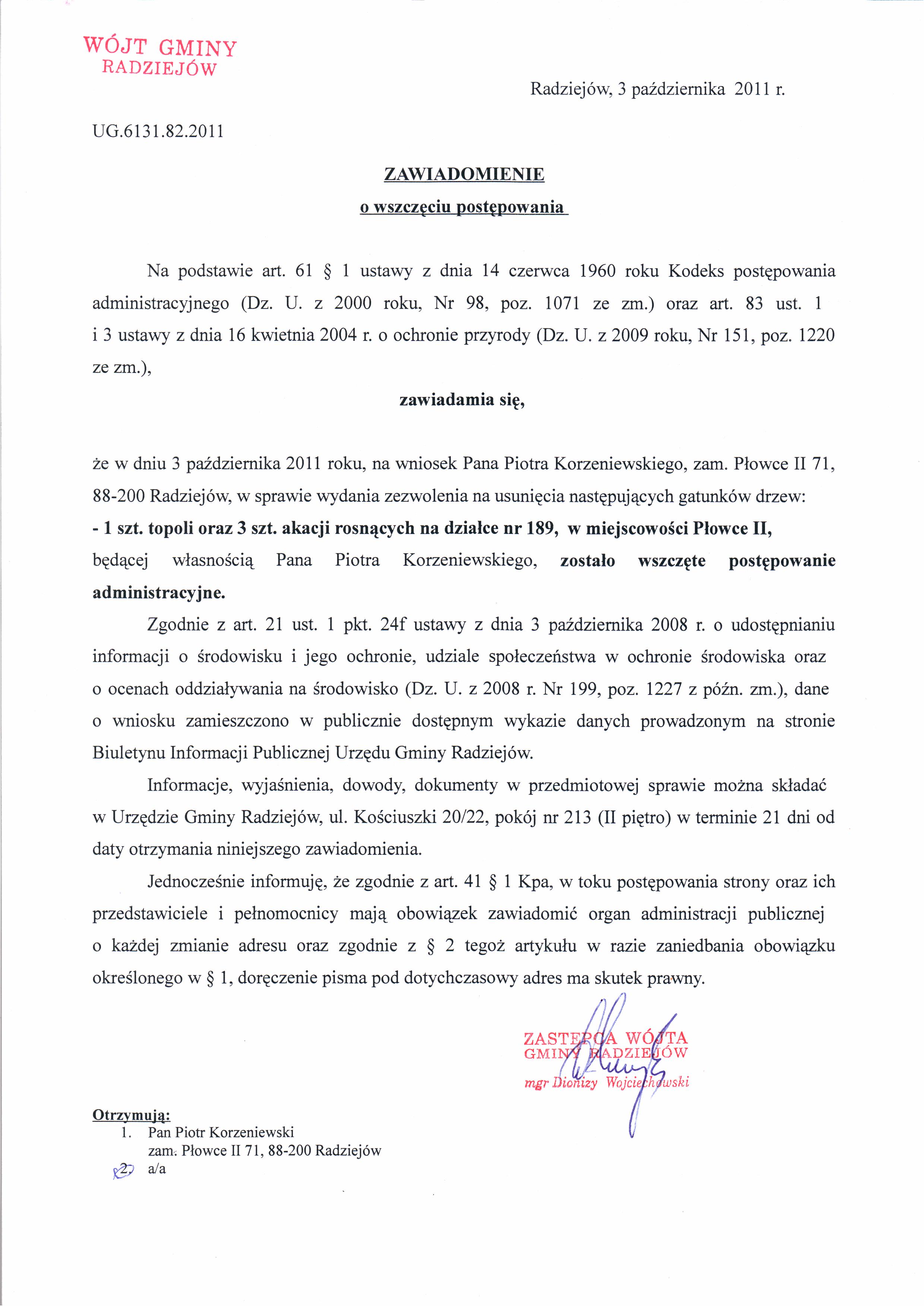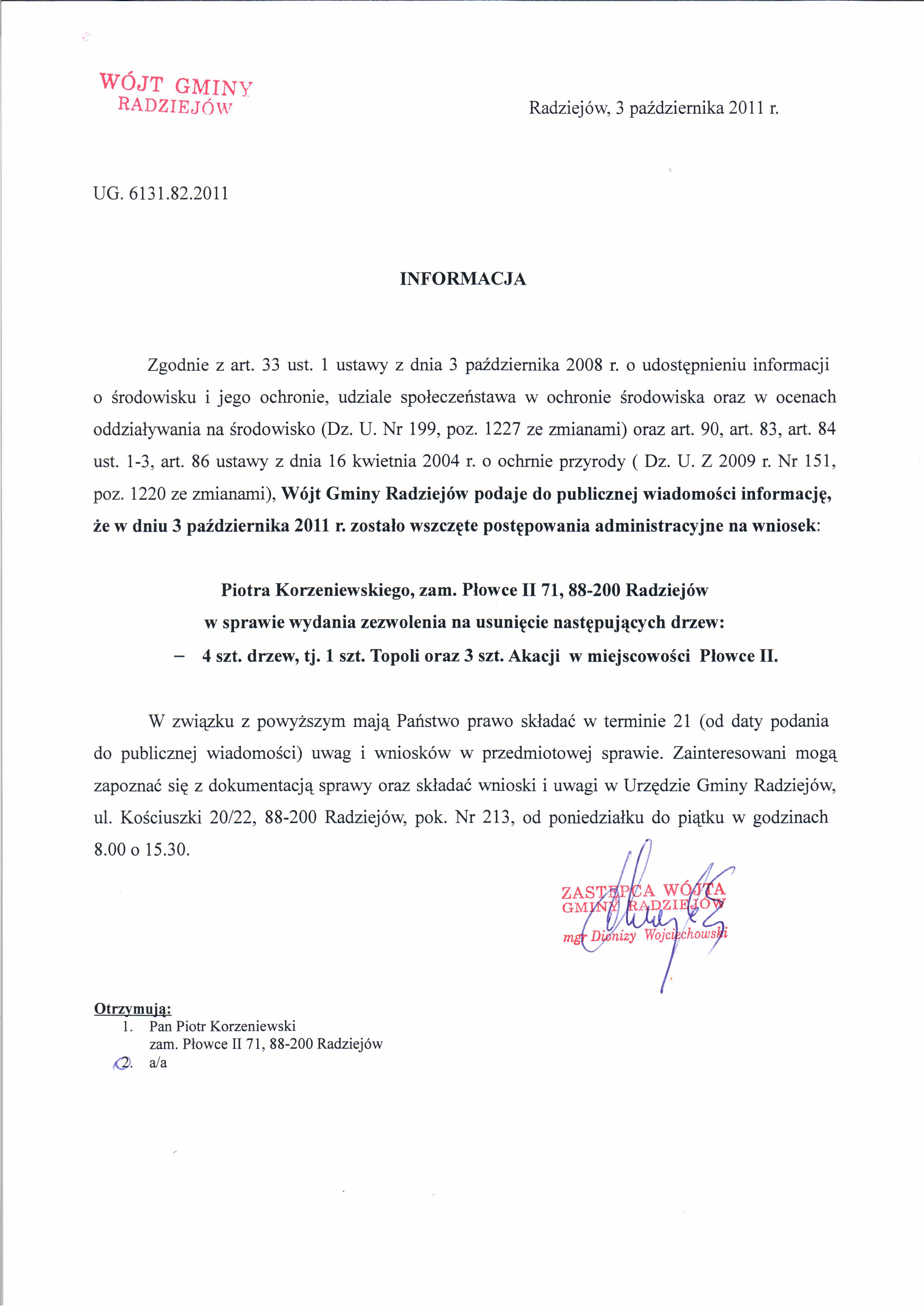 | Zgodnie z art. 21 pkt 1 i 2 ust臋p 24 litera f,ustawy z dnia 3 pa藕dziernika 2008 roku o udost臋pnieniu informacji o 艣rodowisku i jego ochronie, udziale spo艂ecze艅stwa w ochronie 艣rodowiska oraz ocenach oddzia艂ywania na 艣rodowisko (Dz.U.z 2008 r. Nr 199 poz.1227) oraz art. 83 ust. 1 i 3 ustawy z dnia 16 kwietnia 2004 roku o ochronie przyrody (Dz. U. z 2009 r. Nr 151, poz. 1220 ze zmianami) W贸jt Gminy Radziej贸w podaje do publicznej wiadomo艣ci informacj臋, 偶e w dniu 3 pa藕dziernika 2011 r. zosta艂o wszcz臋te post臋powanie administracyjne na wniosek: