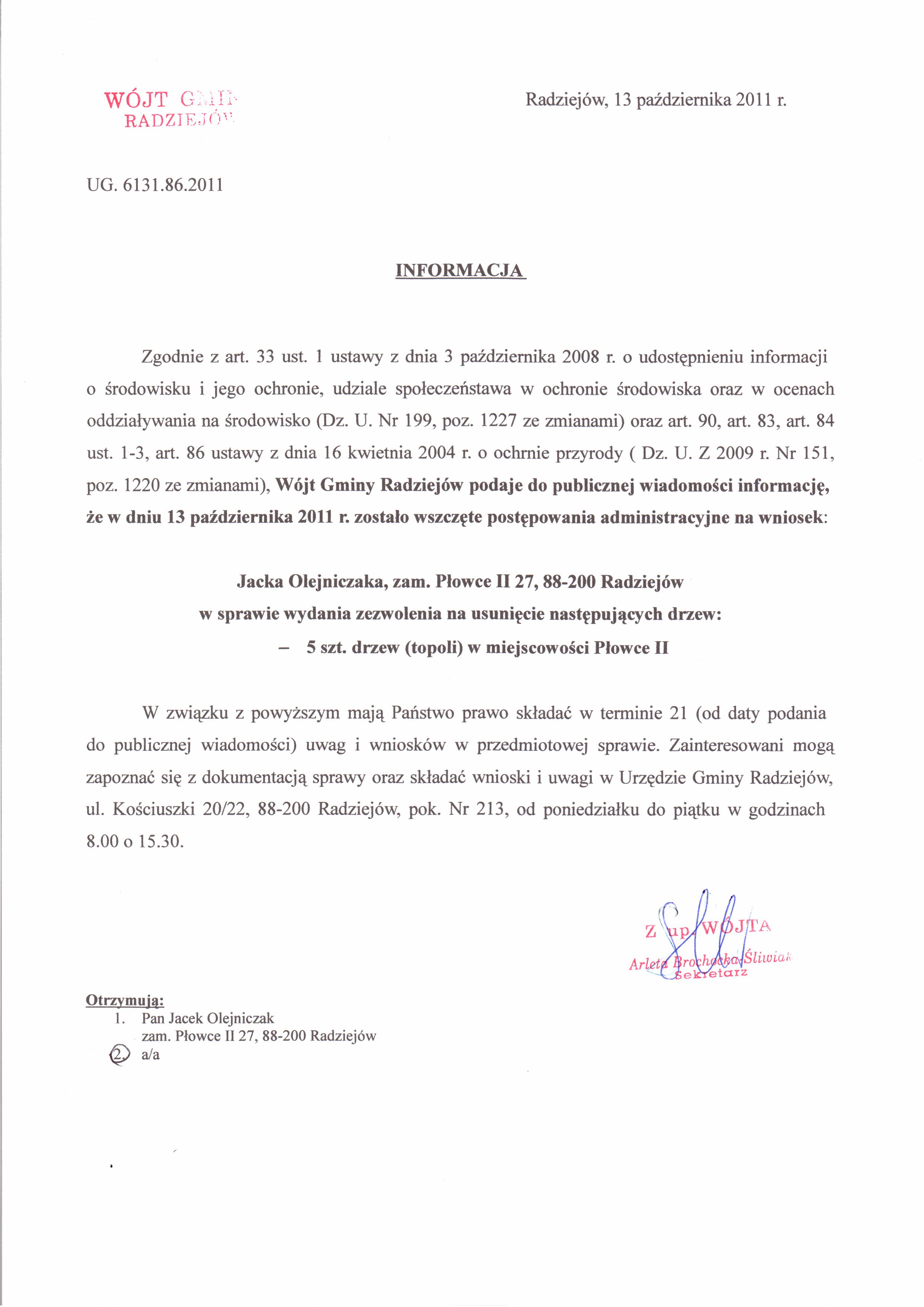 ZAWIADOMIENIE o umieszczeniu w publicznie dost臋pnym wykazie danych - zezwolenie na wycink臋 drzew - P艂owce II - Jacek Olejniczak