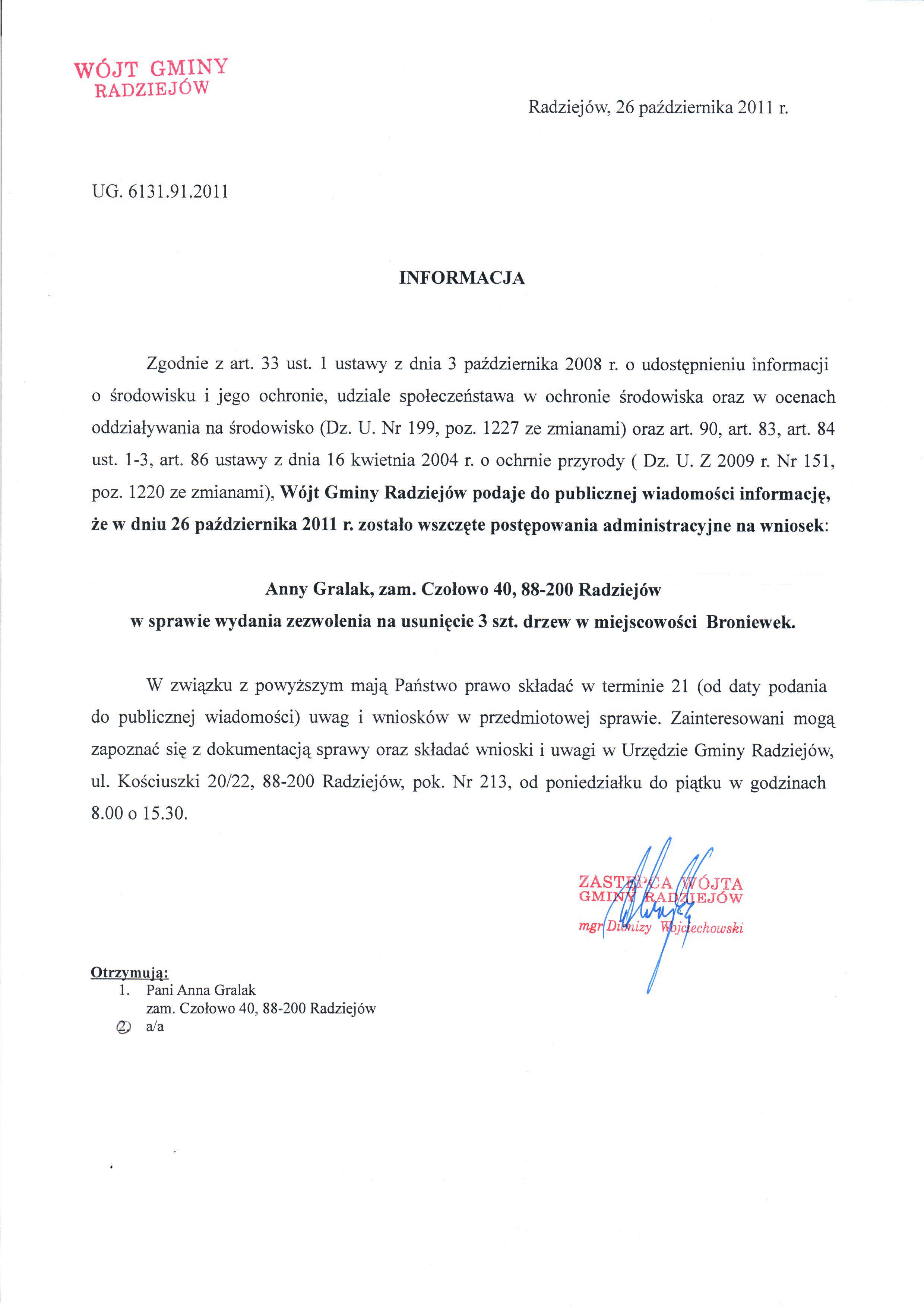 Zgodnie z art. 21 pkt 1 i 2 ust臋p 24 litera f,ustawy z dnia 3 pa藕dziernika 2008 roku o udost臋pnieniu informacji o 艣rodowisku i jego ochronie, udziale spo艂ecze艅stwa w ochronie 艣rodowiska oraz ocenach oddzia艂ywania na 艣rodowisko (Dz.U.z 2008 r. Nr 199 poz.1227) oraz art. 83 ust. 1 i 3 ustawy z dnia 16 kwietnia 2004 roku o ochronie przyrody (Dz. U. z 2009 r. Nr 151, poz. 1220 ze zmianami) W贸jt Gminy Radziej贸w podaje do publicznej wiadomo艣ci informacj臋, 偶e w dniu 26 pa藕dziernika 2011 r. zosta艂o wszcz臋te post臋powanie administracyjne na wniosek: