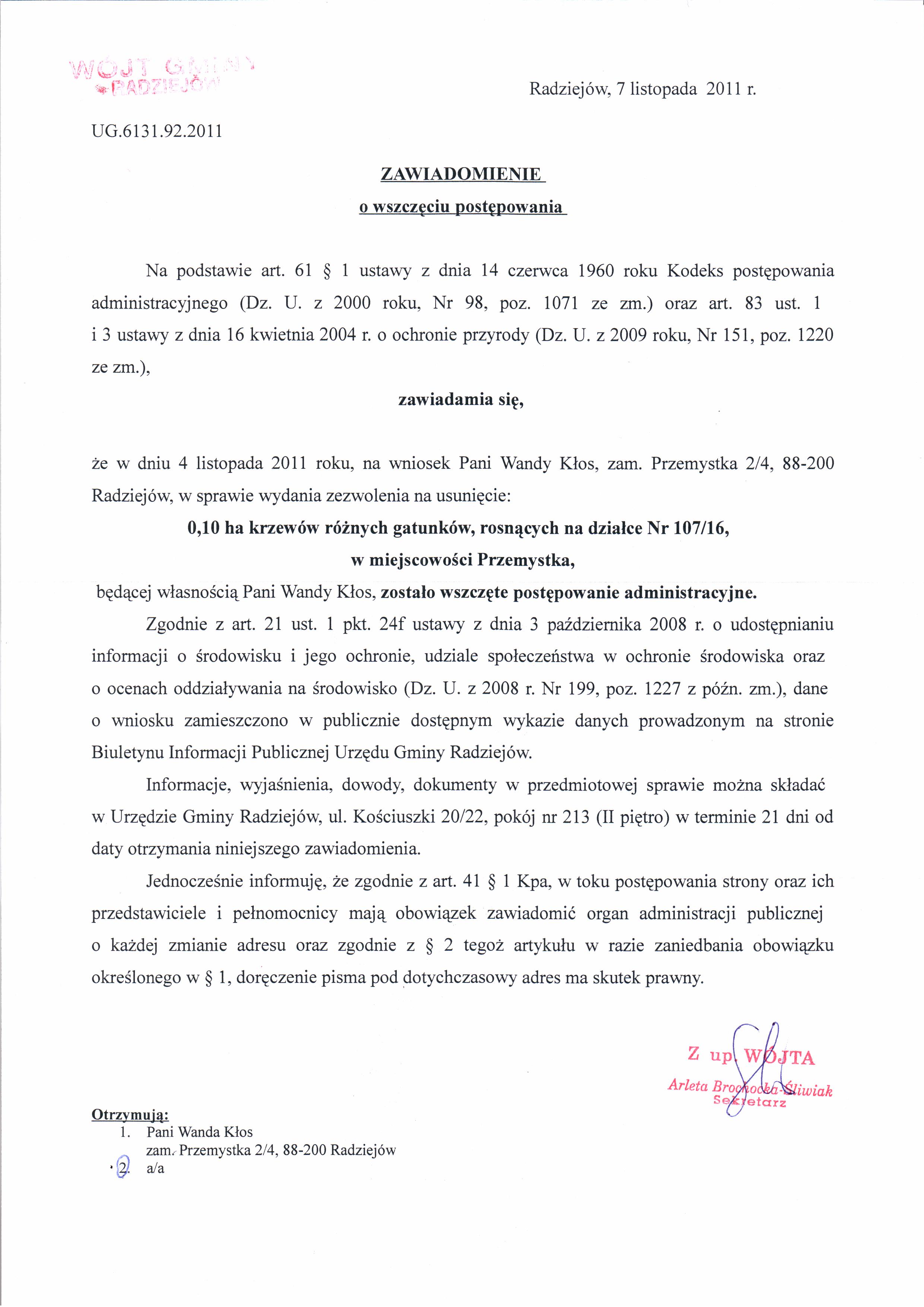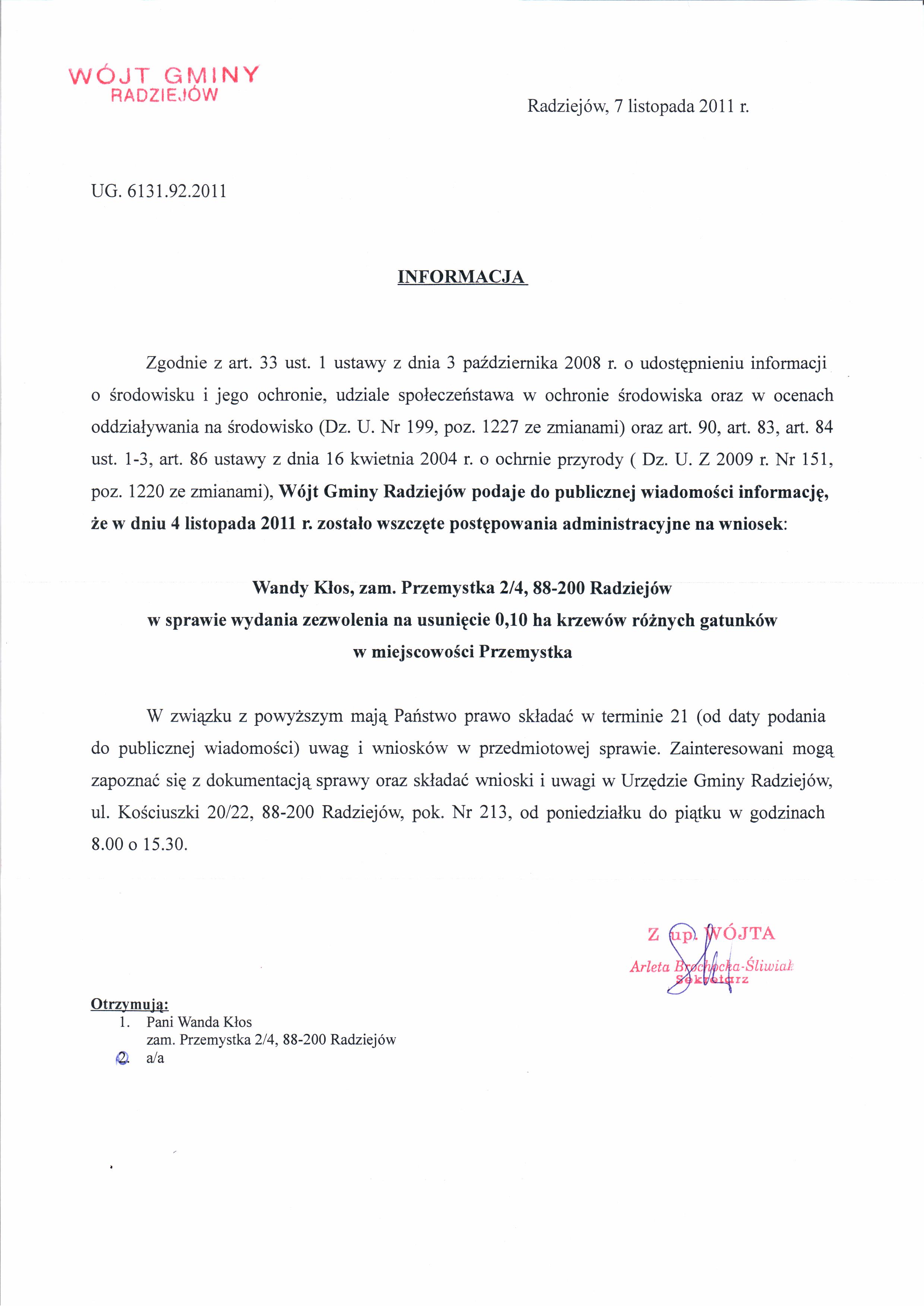 Zgodnie z art. 21 pkt 1 i 2 ust臋p 24 litera f,ustawy z dnia 3 pa藕dziernika 2008 roku o udost臋pnieniu informacji o 艣rodowisku i jego ochronie, udziale spo艂ecze艅stwa w ochronie 艣rodowiska oraz ocenach oddzia艂ywania na 艣rodowisko (Dz.U.z 2008 r. Nr 199 poz.1227) oraz art. 83 ust. 1 i 3 ustawy z dnia 16 kwietnia 2004 roku o ochronie przyrody (Dz. U. z 2009 r. Nr 151, poz. 1220 ze zmianami) W贸jt Gminy Radziej贸w podaje do publicznej wiadomo艣ci informacj臋, 偶e w dniu 7 listopada 2011 r. zosta艂o wszcz臋te post臋powanie administracyjne na wniosek: