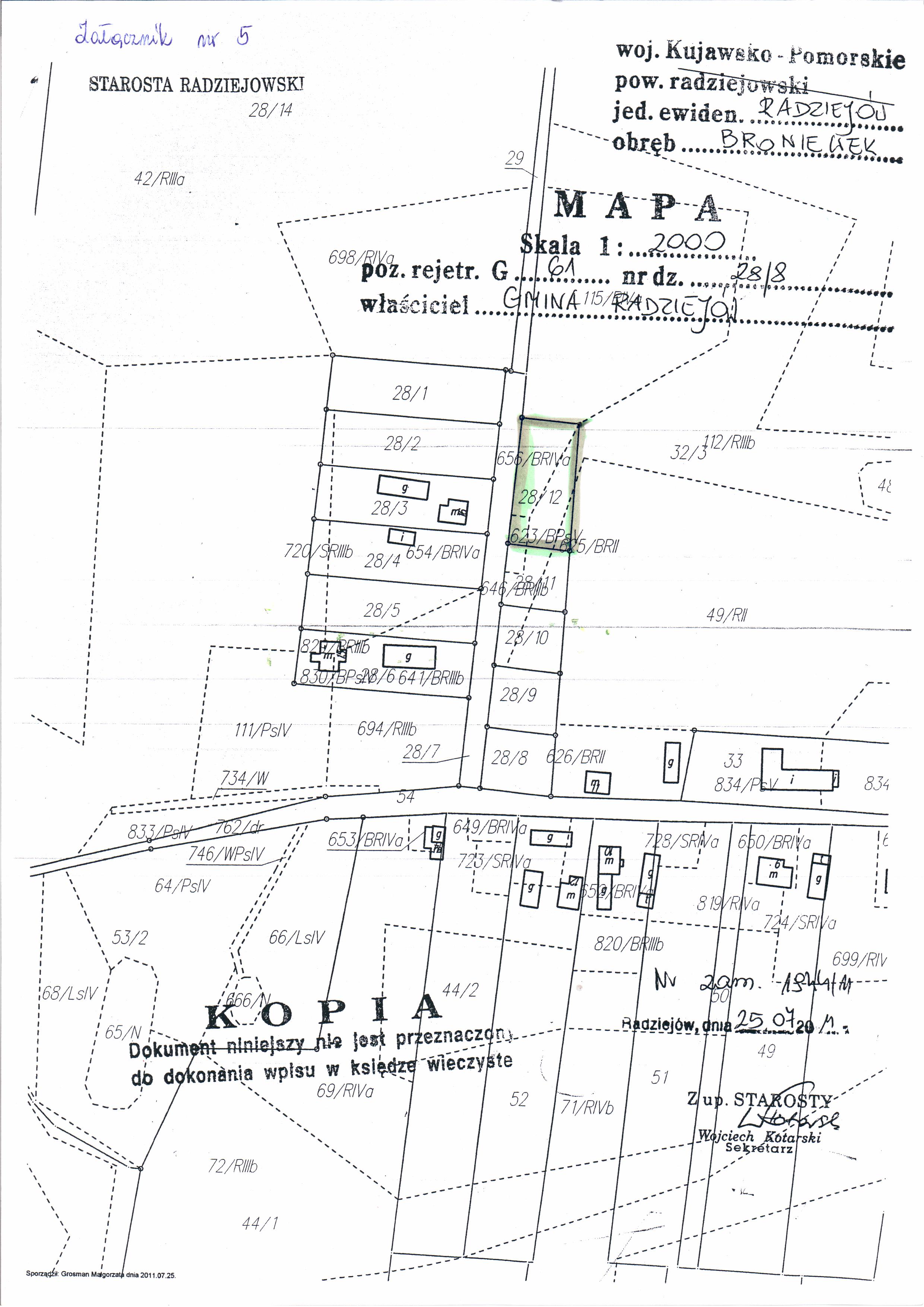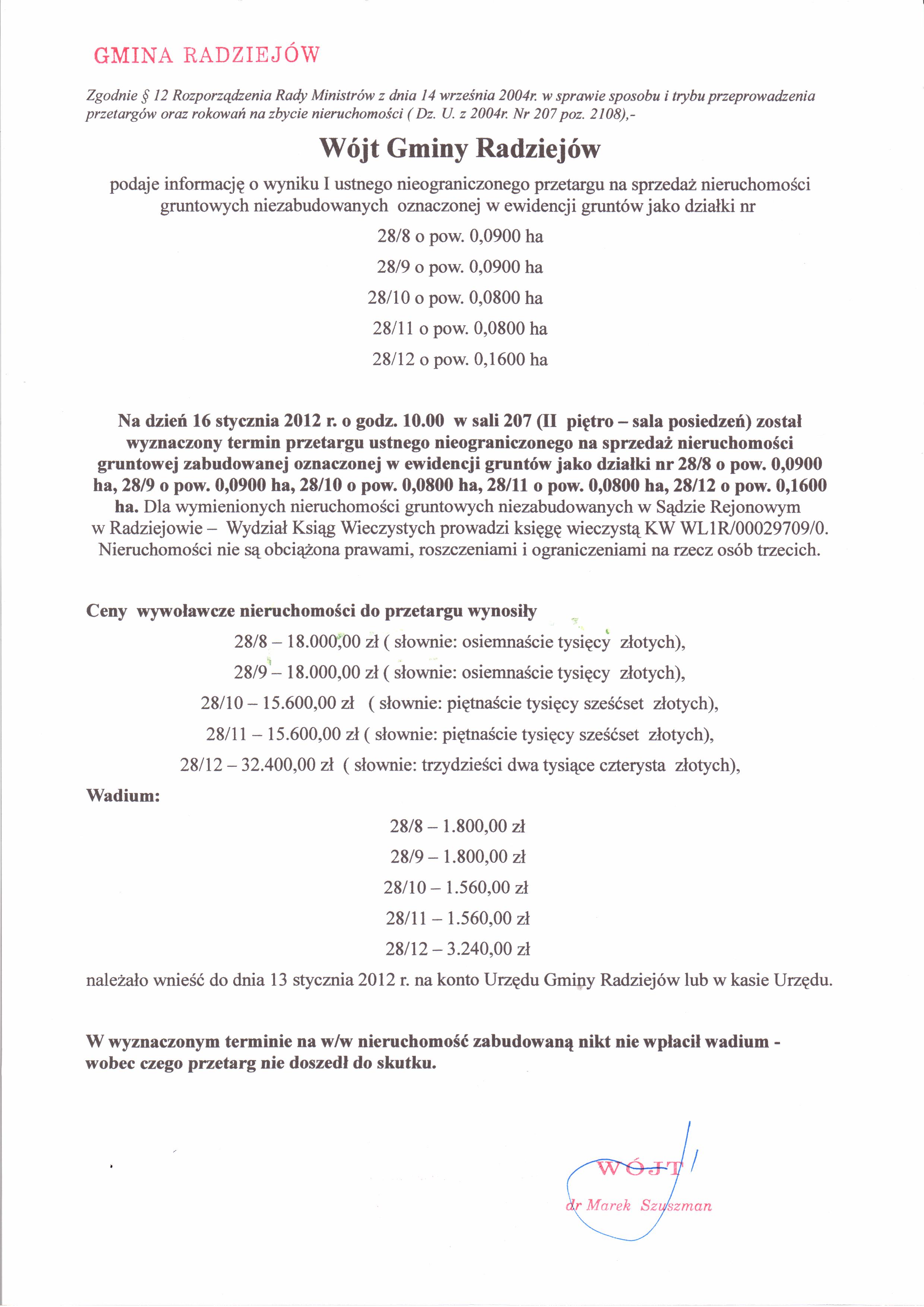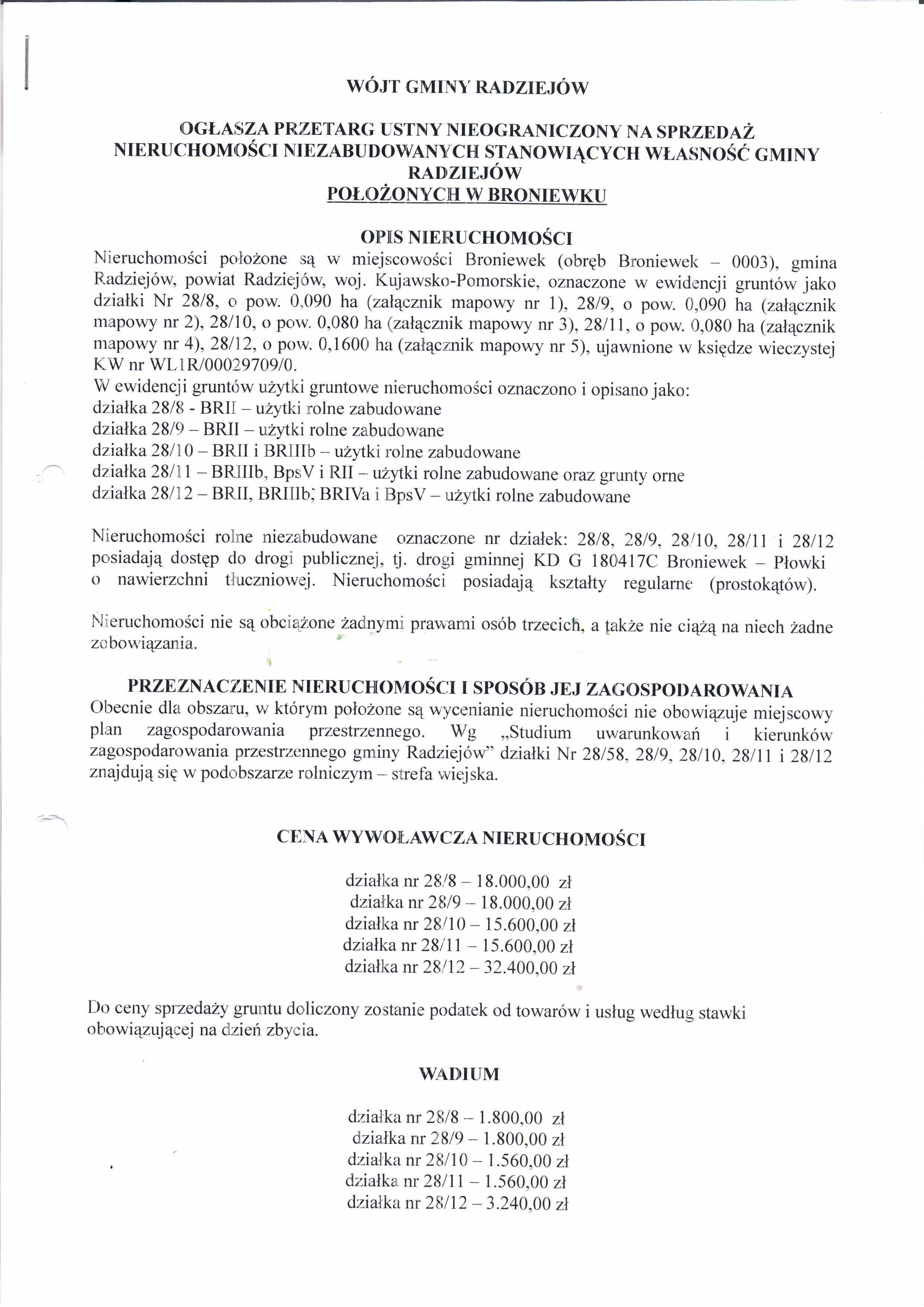 Og艂oszenie o przetargu ustnym nieograniczonym na sprzeda偶 nieruchomo艣ci niezabudowanych stanowi膮cych w艂asno艣膰 Gminy Radziej贸w po艂o偶onych w Broniewku oznaczonych w ewidencji grunt贸w jako dzia艂ki Nr 28/8, o pow. 0,0,0900 ha, 28/9 o pow. 0,0900 ha, 28/10 o pow. 0,0800 ha, 28/11 o pow. 0,0800 ha oraz 28/12 o pow. 0,1600 ha, ujawnionych w ksi臋dze wieczystej KW WL1R/00029709/0.