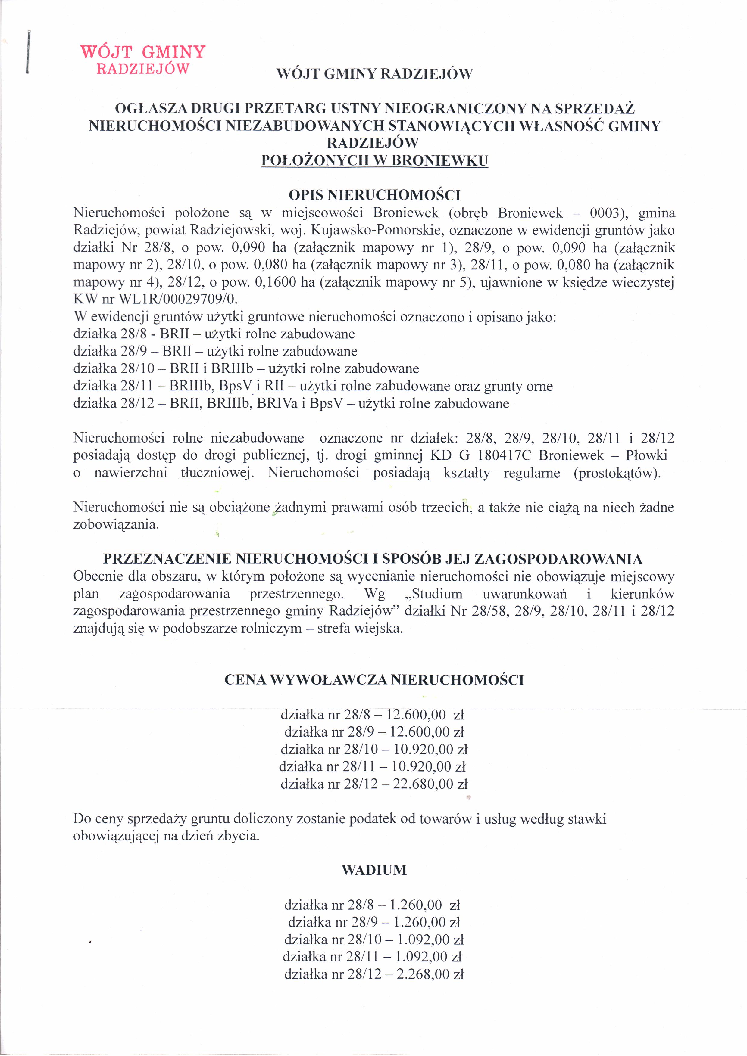 Og艂oszenie o drugim przetargu ustnym nieograniczonym na sprzeda偶 nieruchomo艣ci niezabudowanych stanowi膮cych w艂asno艣膰 Gminy Radziej贸w po艂o偶onych w Broniewku oznaczonych w ewidencji grunt贸w jako dzia艂ki Nr 28/8, o pow. 0,0,0900 ha, 28/9 o pow. 0,0900 ha, 28/10 o pow. 0,0800 ha, 28/11 o pow. 0,0800 ha oraz 28/12 o pow. 0,1600 ha, ujawnionych w ksi臋dze wieczystej KW WL1R/00029709/0.