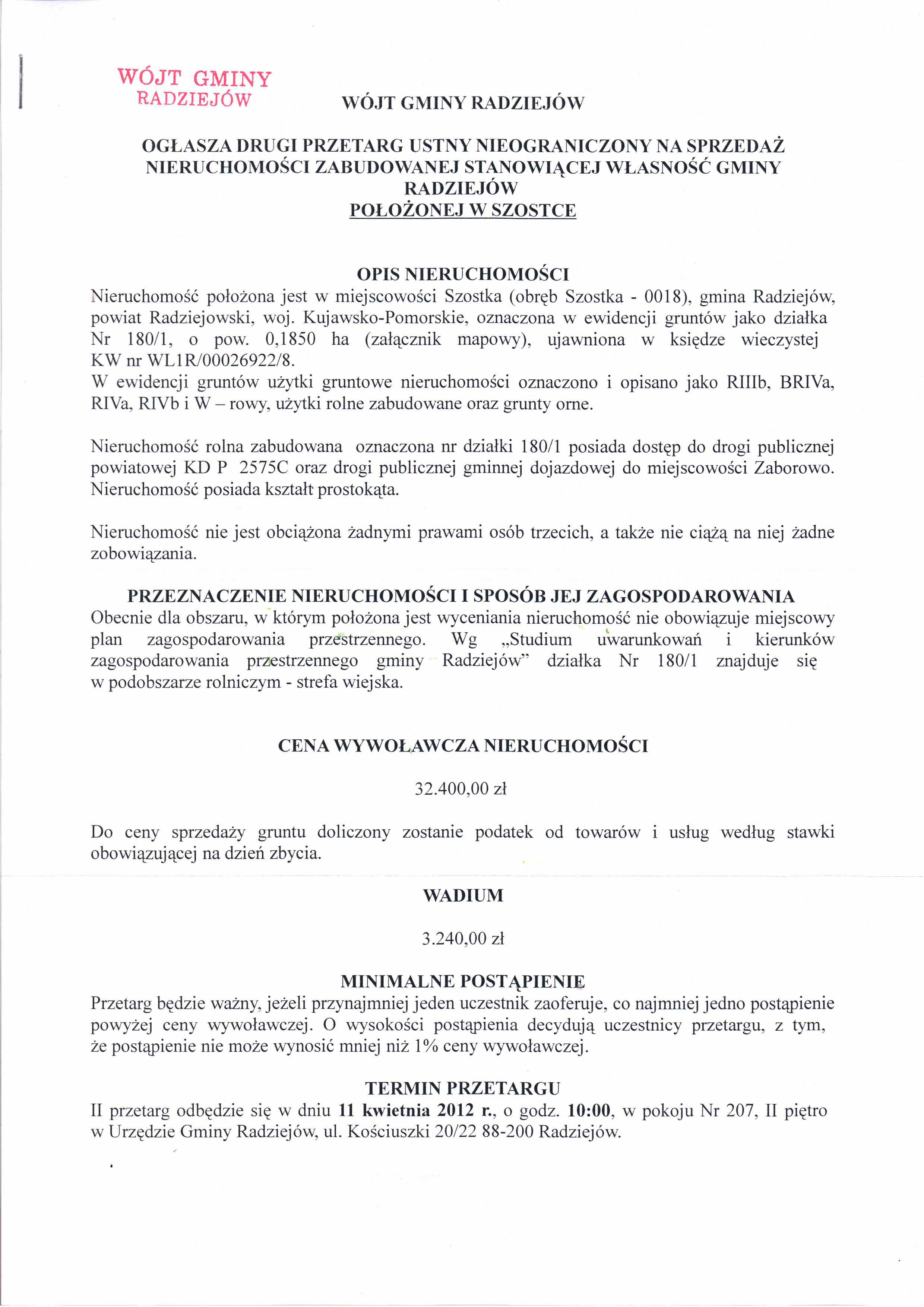 Og艂oszenie o drugim przetargu ustnym nieograniczonym na sprzeda偶 nieruchomo艣ci zabudowanej stanowi膮cej w艂asno艣膰 Gminy Radziej贸w po艂o偶onej w Szostce oznaczonej w ewidencji grunt贸w jako dzia艂ka Nr 180/1, o pow. 0,1850 ha, ujawnionej w ksi臋dze wieczystej KW WL1R/00026922/8.