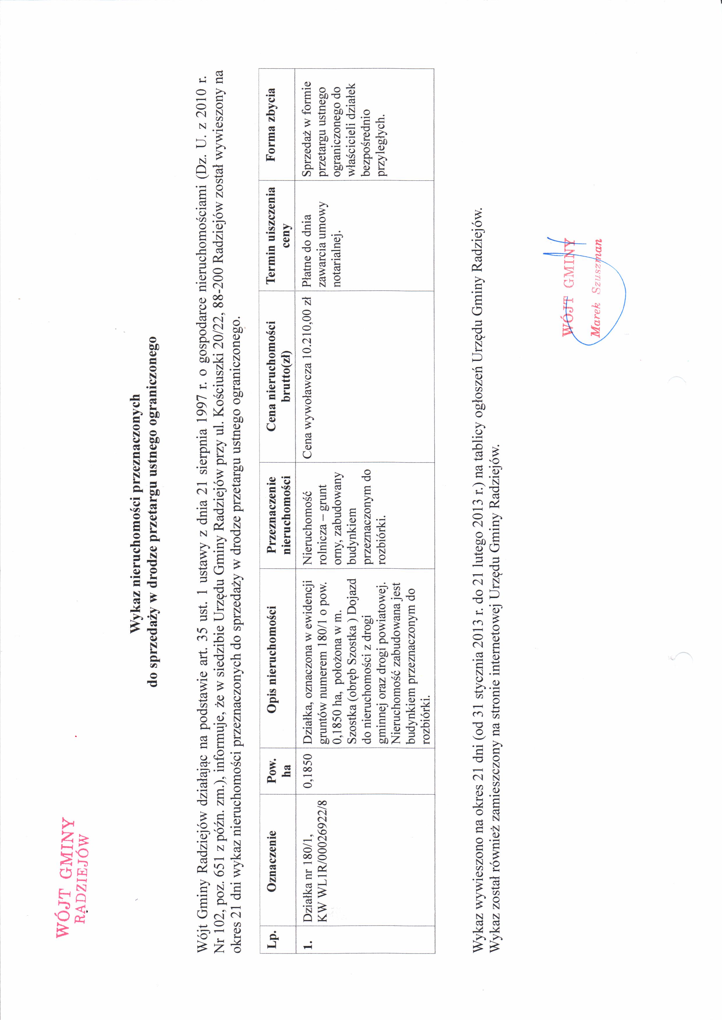 Wykaz nieruchomo艣ci przeznaczonej do sprzeda偶y w drodze przetargu ustnego ograniczonego po艂o偶onej w m. Szostka, oznaczonej w ewid. grunt贸w jako dzia艂ka Nr 180/1.