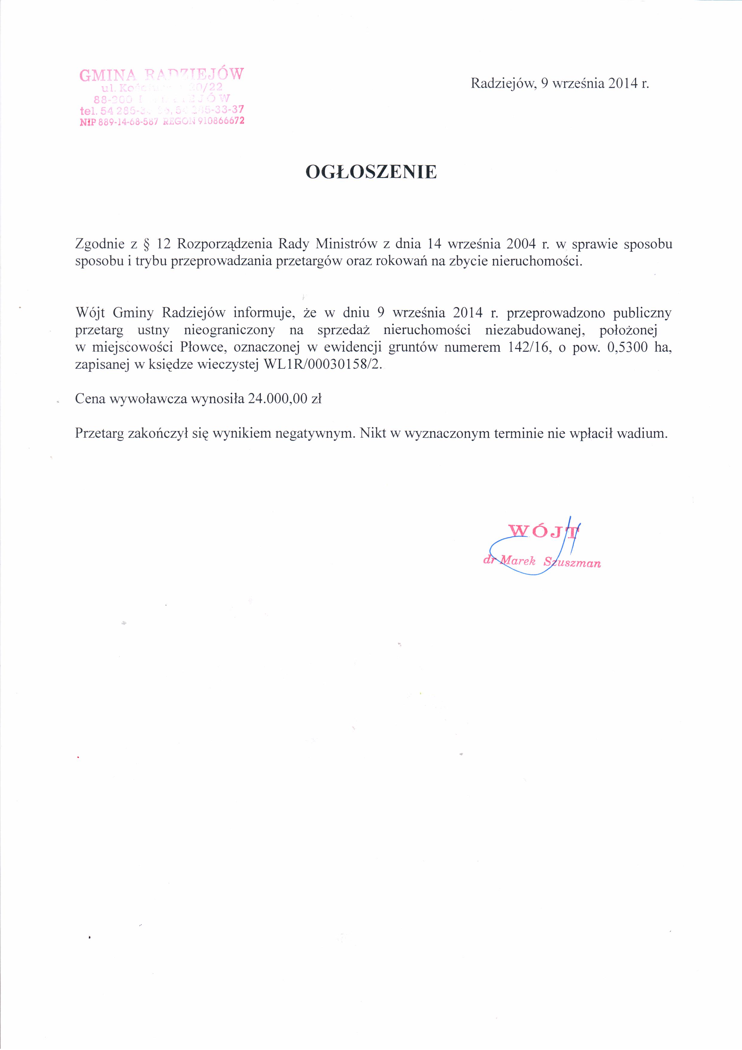 Og艂oszenie o przetargu ustnym nieograniczonym na sprzeda偶 nieruchomo艣ci gruntowej niezabudowanej po艂o偶onej w m. P艂owce II, dzia艂ka Nr 142/16.