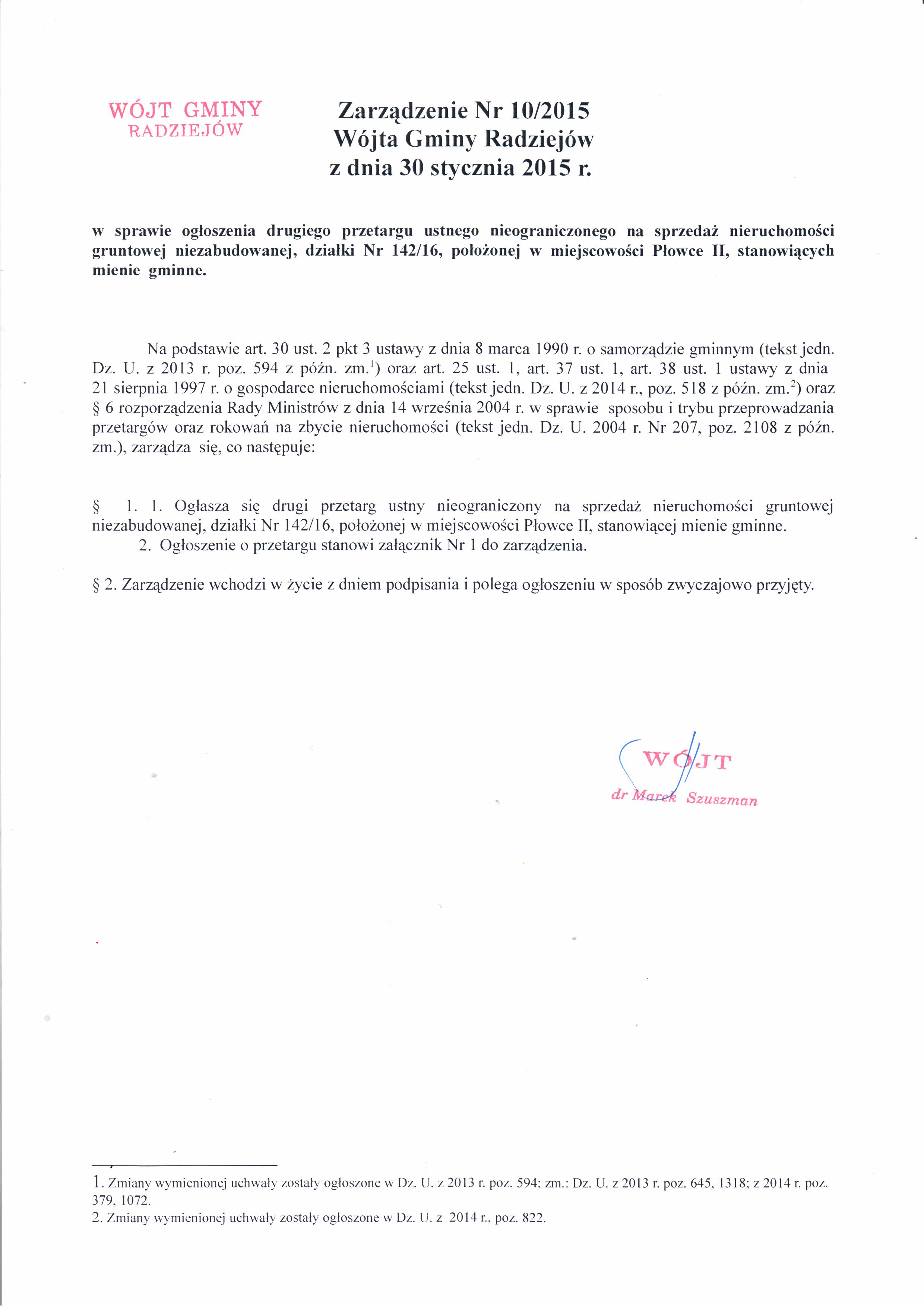 Og艂oszenie o drugim przetargu ustnym nieograniczonym na sprzeda偶 nieruchomo艣ci gruntowej niezabudowanej po艂o偶onej w miejscowo艣ci P艂owce II, gm. Radziej贸w, oznaczonej w ewidencji grunt贸w numerem 142/16, o powierzchni 0,5300 ha (w tym 0,4100 ha rola klasy IIIa oraz 0,1200 ha nieu偶ytek).