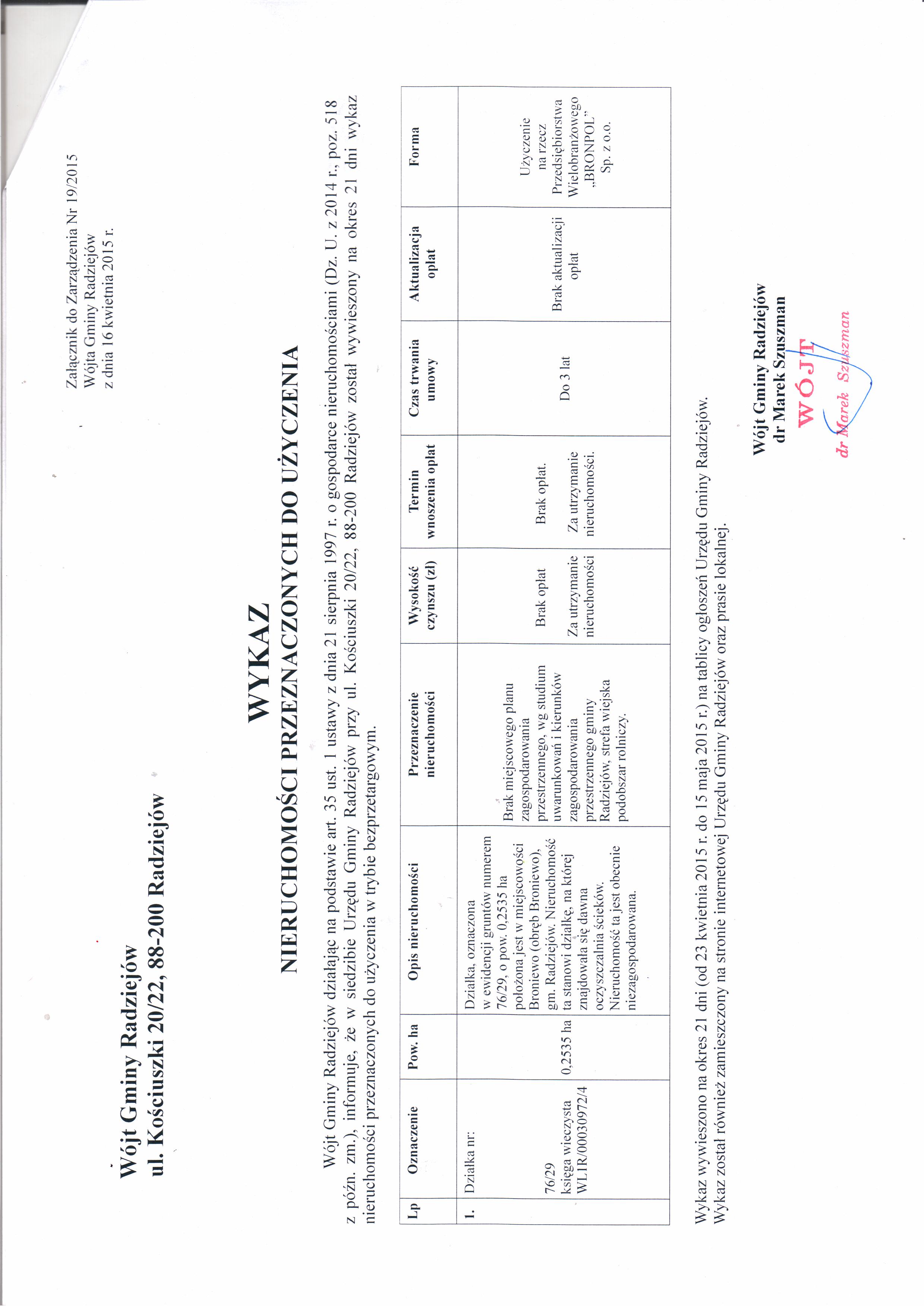 Wykaz nieruchomo艣ci przeznaczonych do dzier偶awy i u偶yczenia w drodze bezprzetargowej, tj. dzia艂ki Nr: 32/1, o pow. 0,0900 ha, po艂o偶ona w miejscowo艣ci Pruchnowo, na rzecz Pana Paw艂a Ciemnego; 63/1, pow. 0,7427 ha, po艂o偶ona w miejscowo艣ci Broniewo, na rzecz P.W. "BRONPOL" Sp. z o.o.; 76/19, pow. 0,2535 ha, po艂o偶ona w miejscowo艣ci Broniewo, na rzecz P.W. "BRONPOL" Sp. z o.o.; cz臋艣膰 dzia艂ki 145, pow. ca艂kowita 3,3500 ha, po艂o偶ona w miejscowo艣ci Bieganowo, na rzecz Pan贸w Ryszarda Walczaka, Miros艂awa Chrupczaka i Krzysztofa Bartczaka.