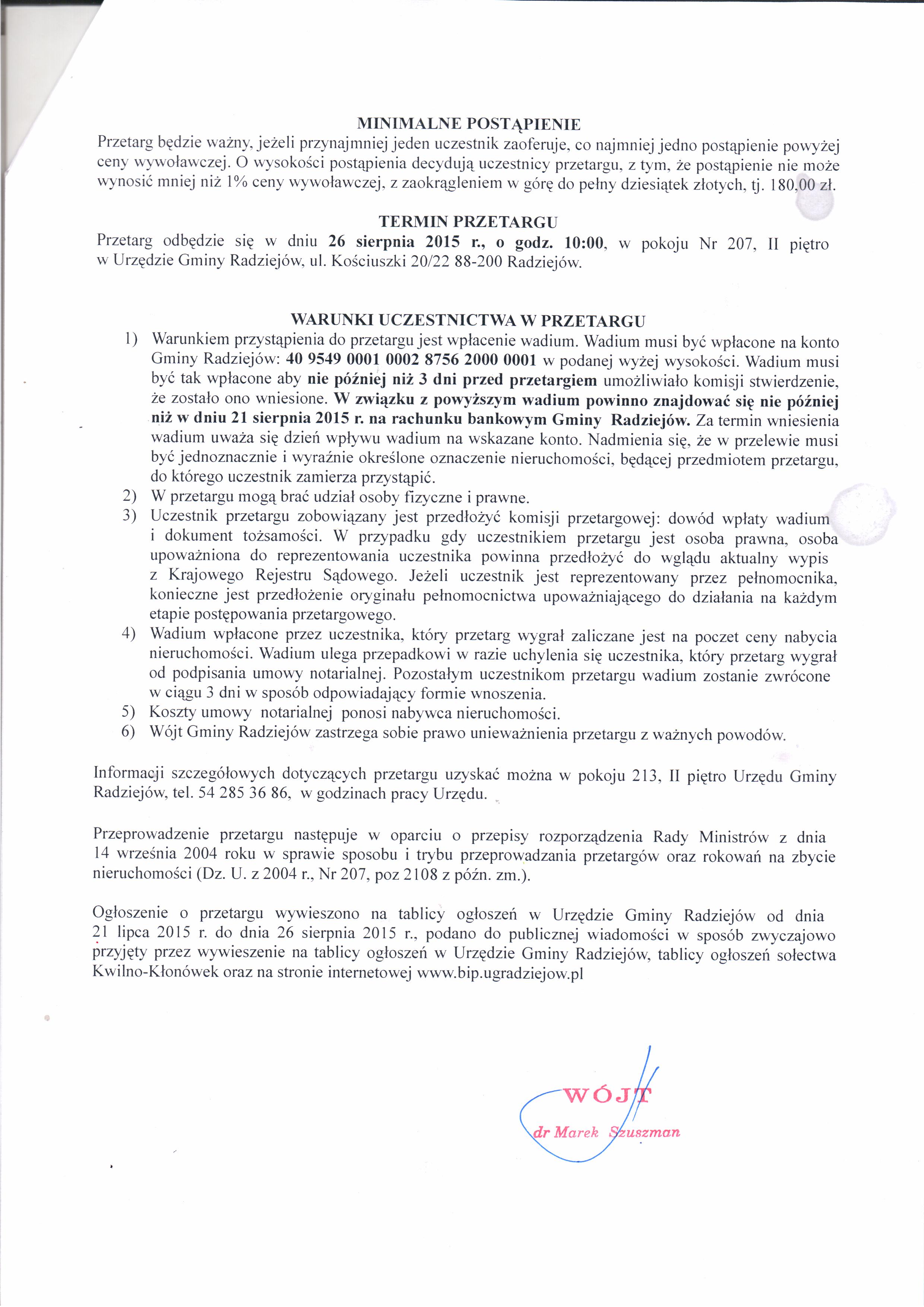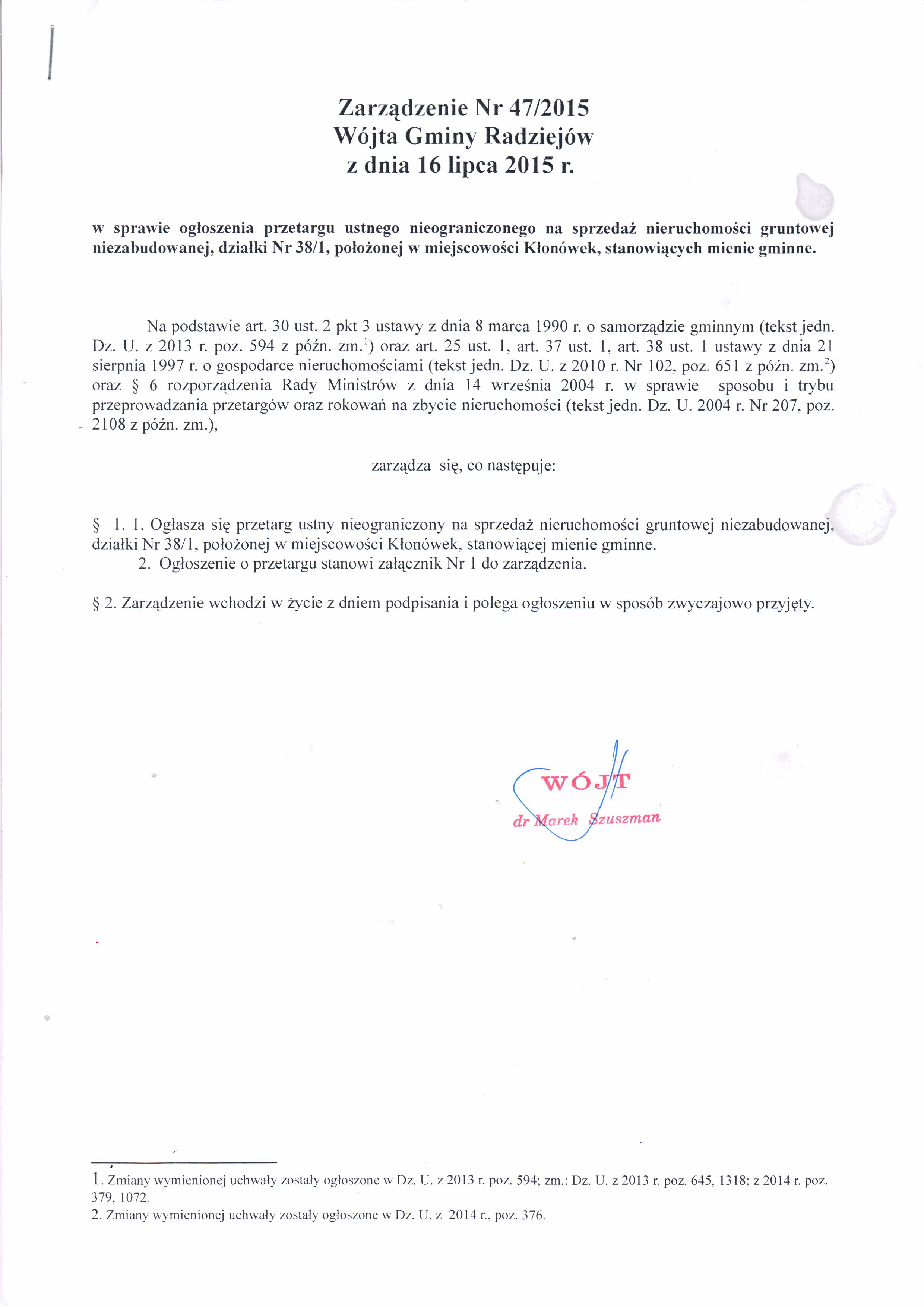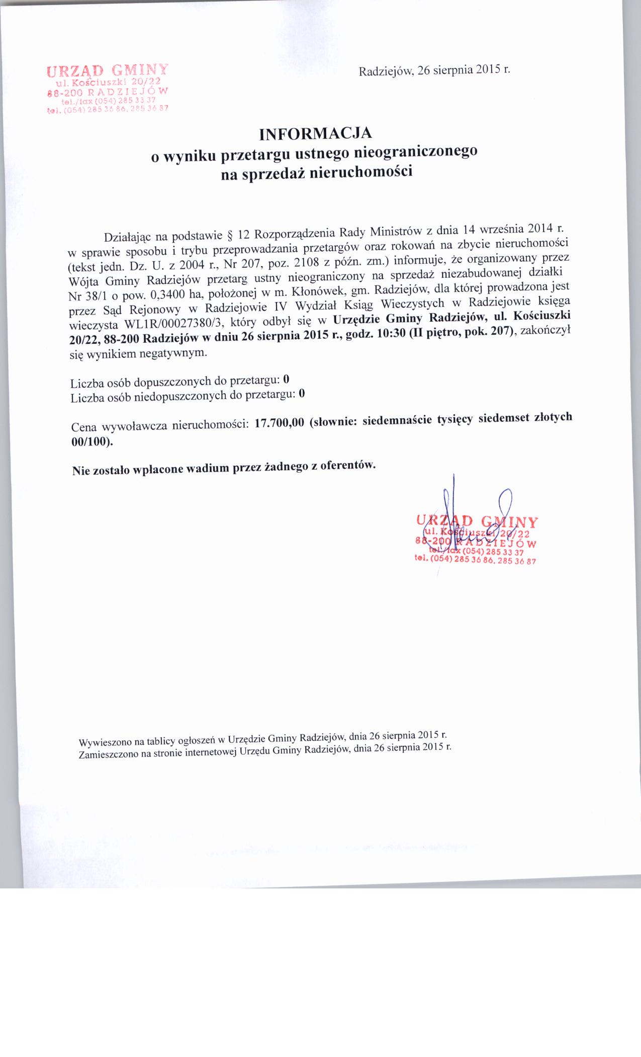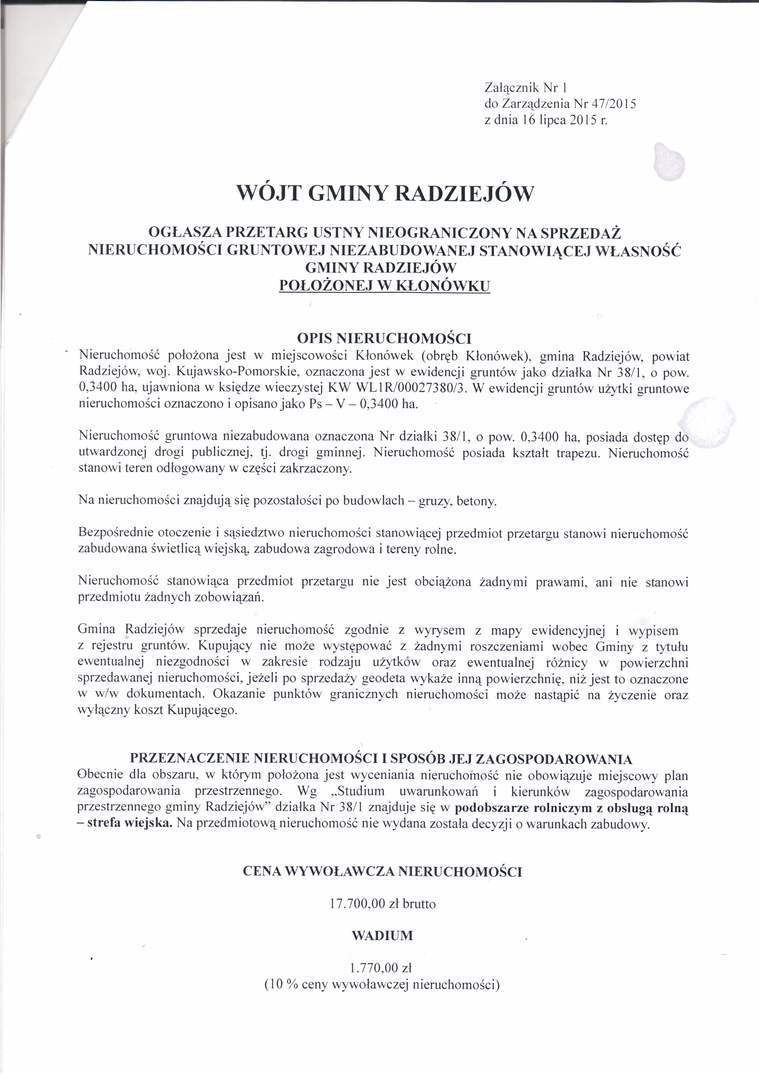 Og艂oszenie o przetargu ustnym nieograniczonym na sprzeda偶 nieruchomo艣ci gruntowej niezabudowanej po艂o偶onej w miejscowo艣ci K艂on贸wek, gm. Radziej贸w, oznaczonej w ewidencji grunt贸w numerem 38/1, o powierzchni 0,3400 ha (u偶ytki gruntowe - Ps - V - 0,3400 ha).