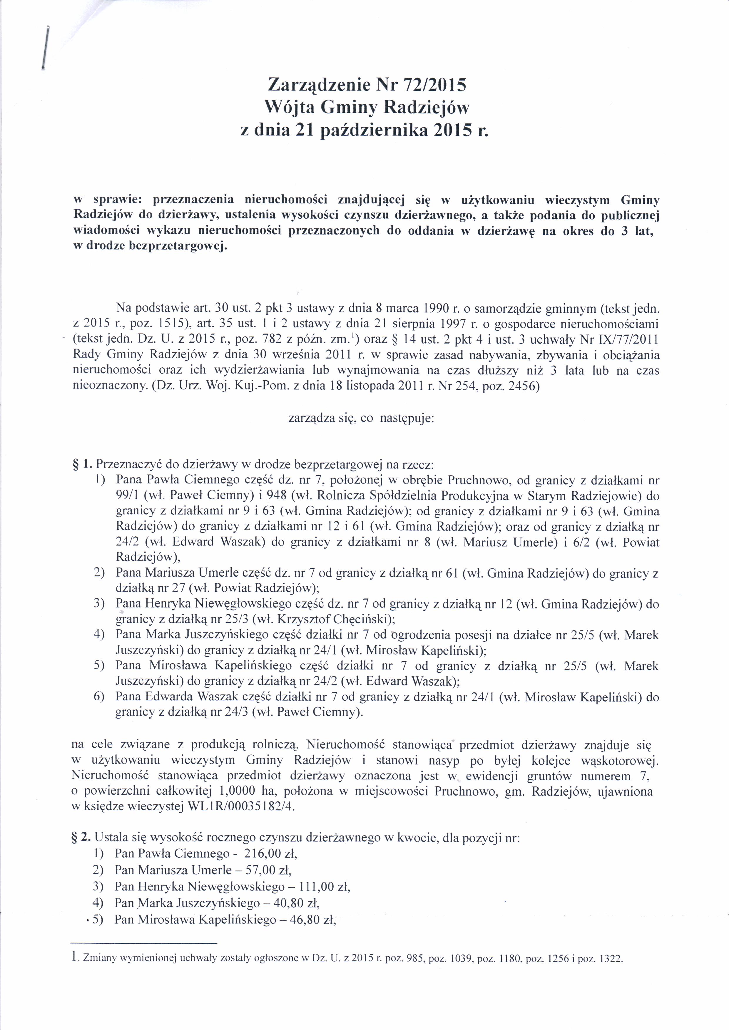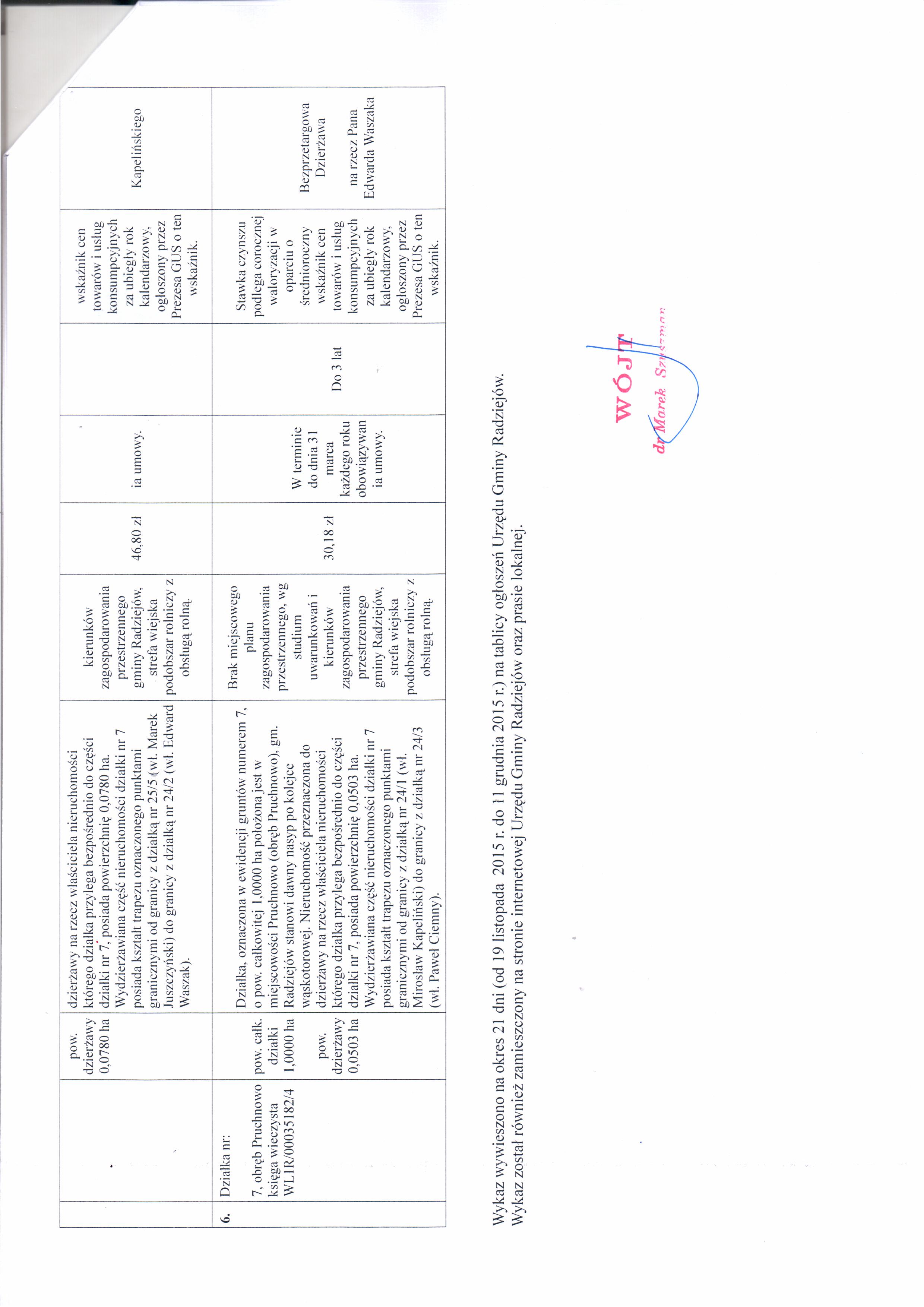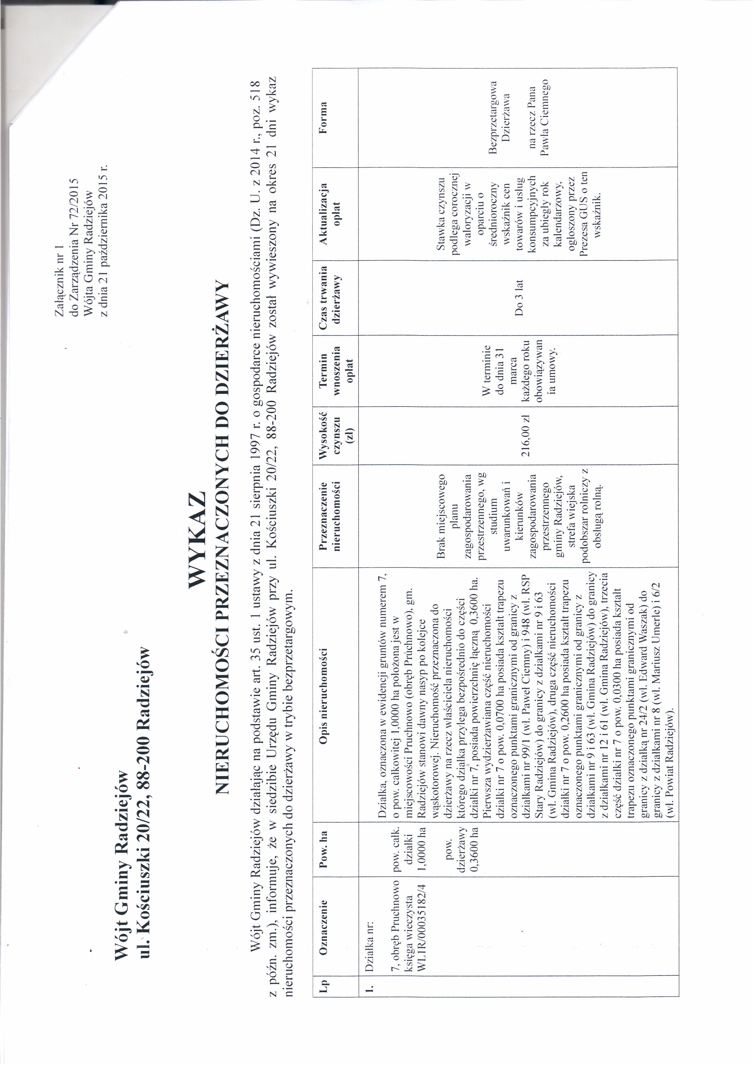 Wykaz nieruchomo艣ci przeznaczonych do dzier偶awy w drodze bezprzetargowej na okres do 3 lat, tj. cz臋艣ci dzia艂ki nr 7 (obr臋b Pruchnowo) o pow. 1,0000 ha po艂o偶onej w miejscowo艣ci Pruchnowo,znajduj膮cej si臋 w u偶ytkowaniu wieczystym Gminy Radziej贸w, na rzecz rolnik贸w kt贸rych nieruchomo艣ci przylegaj膮 do w/w dzia艂ki.