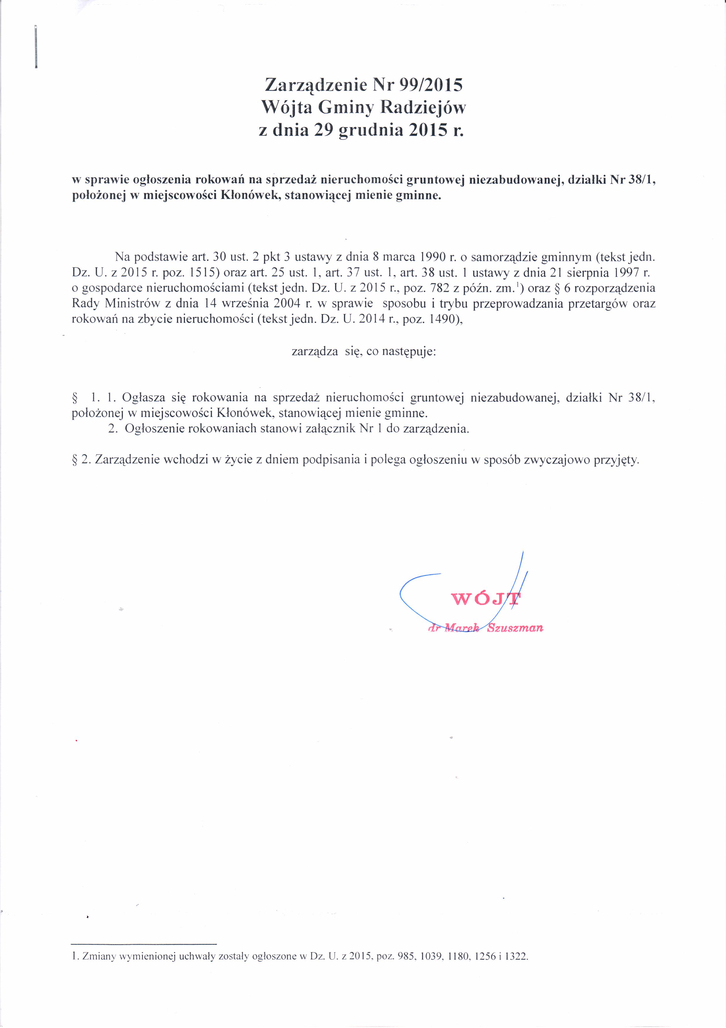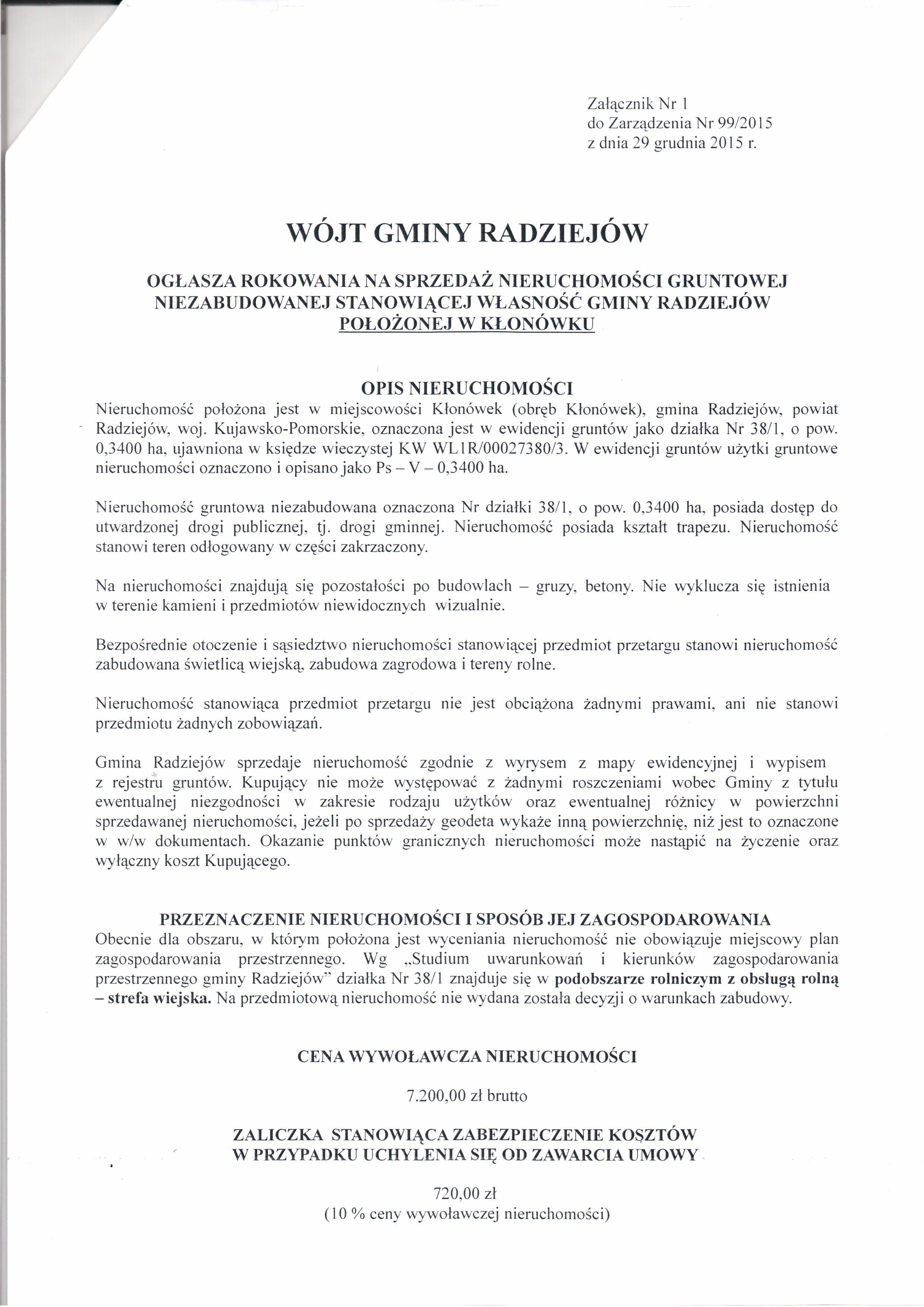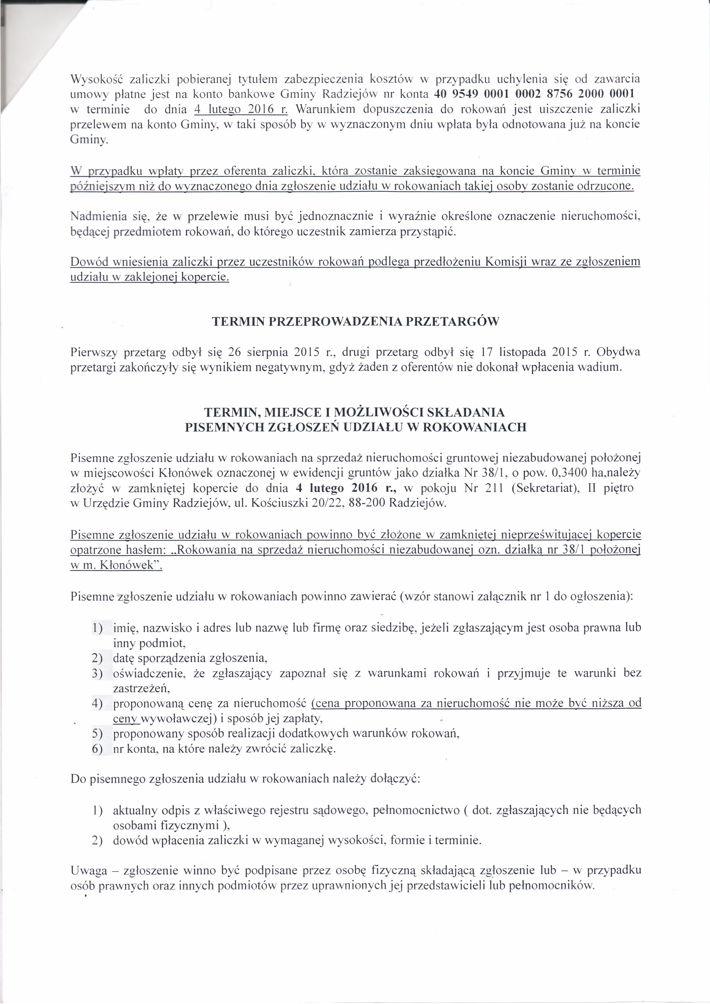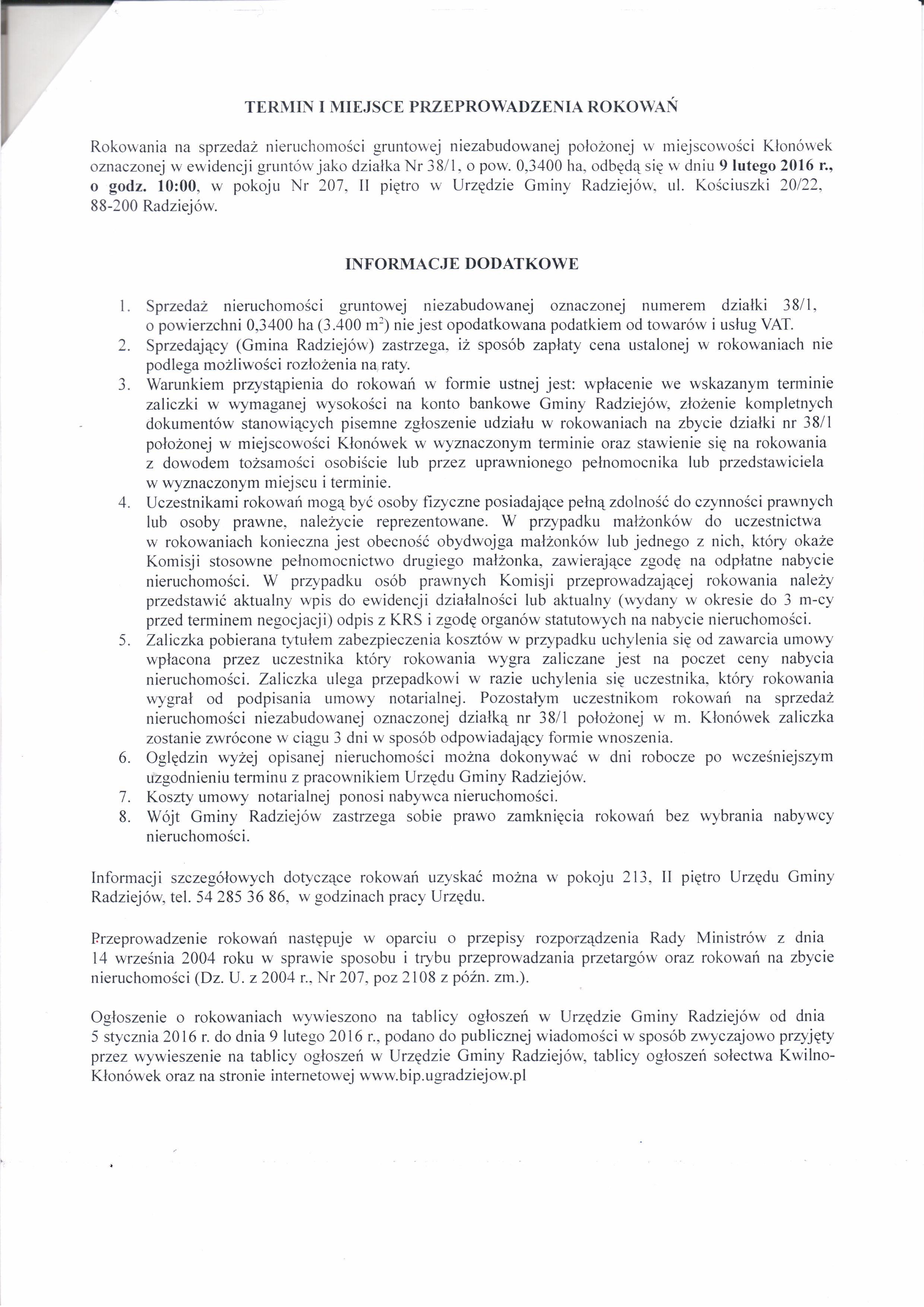 Og艂oszenie o rokowaniach na sprzeda偶 nieruchomo艣ci gruntowej niezabudowanej po艂o偶onej w miejscowo艣ci K艂on贸wek, gm. Radziej贸w, oznaczonej w ewidencji grunt贸w numerem 38/1, o powierzchni 0,3400 ha (u偶ytki gruntowe - Ps - V - 0,3400 ha).