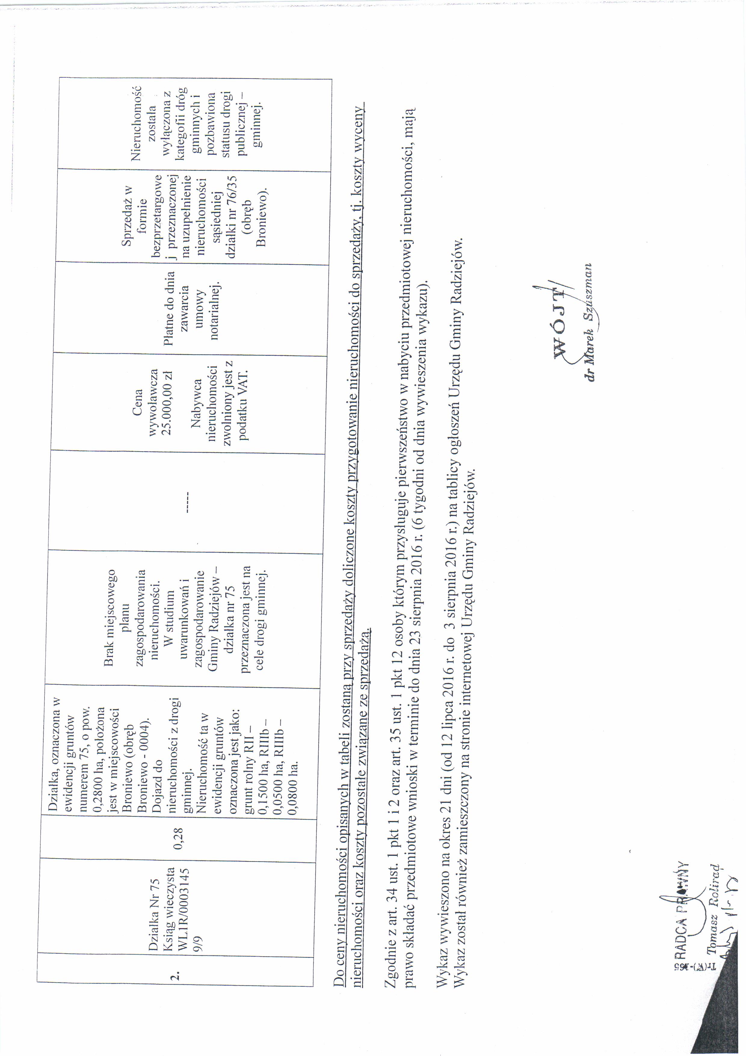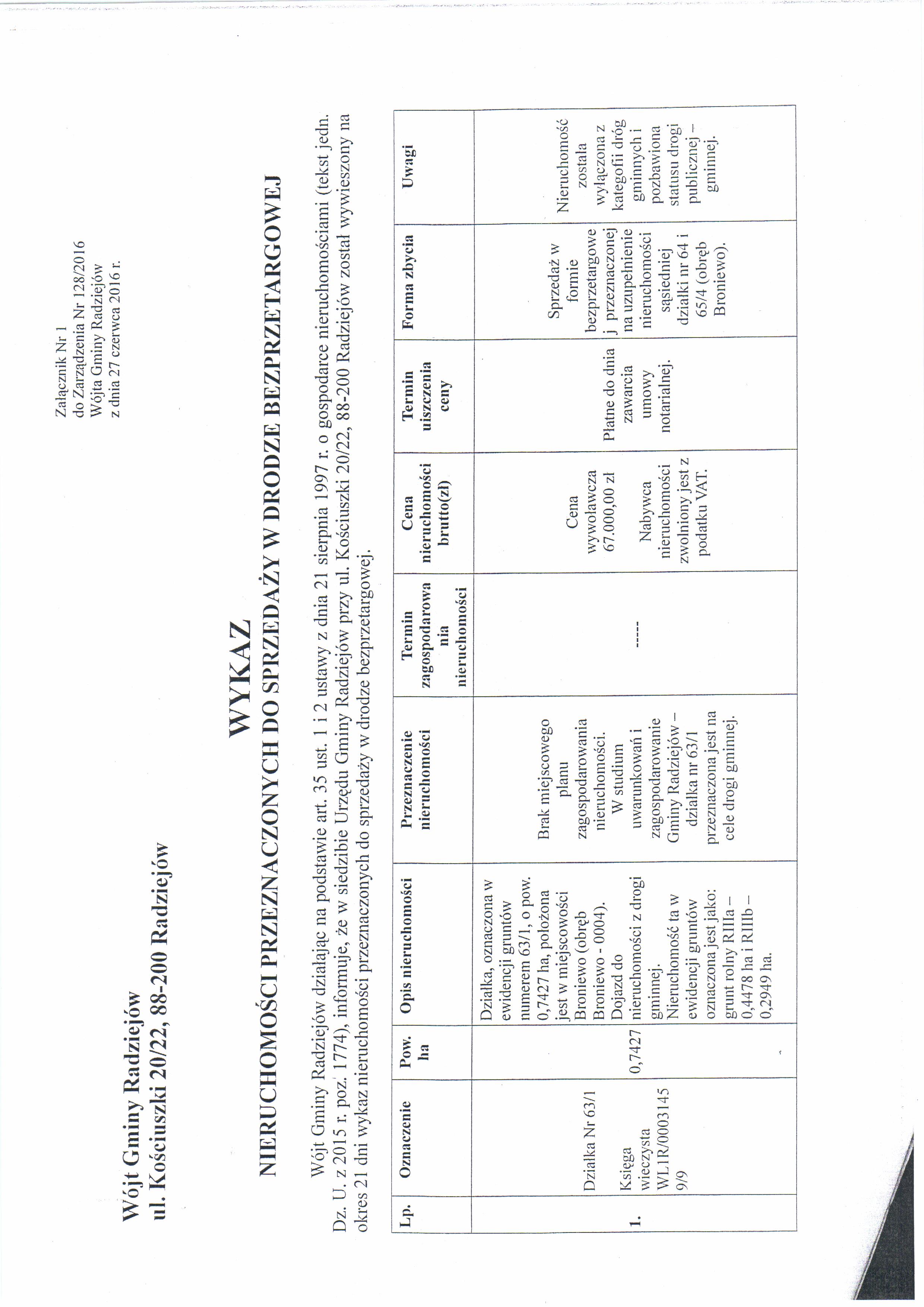Wykaz nieruchomo艣ci,tj. dzia艂ki nr 63/1 i dzia艂ki nr 75 po艂o偶onych w miejscowo艣ci Broniewo, gm. Radziej贸w, przeznaczonych do sprzeda偶y w trybie bezprzetargowym.