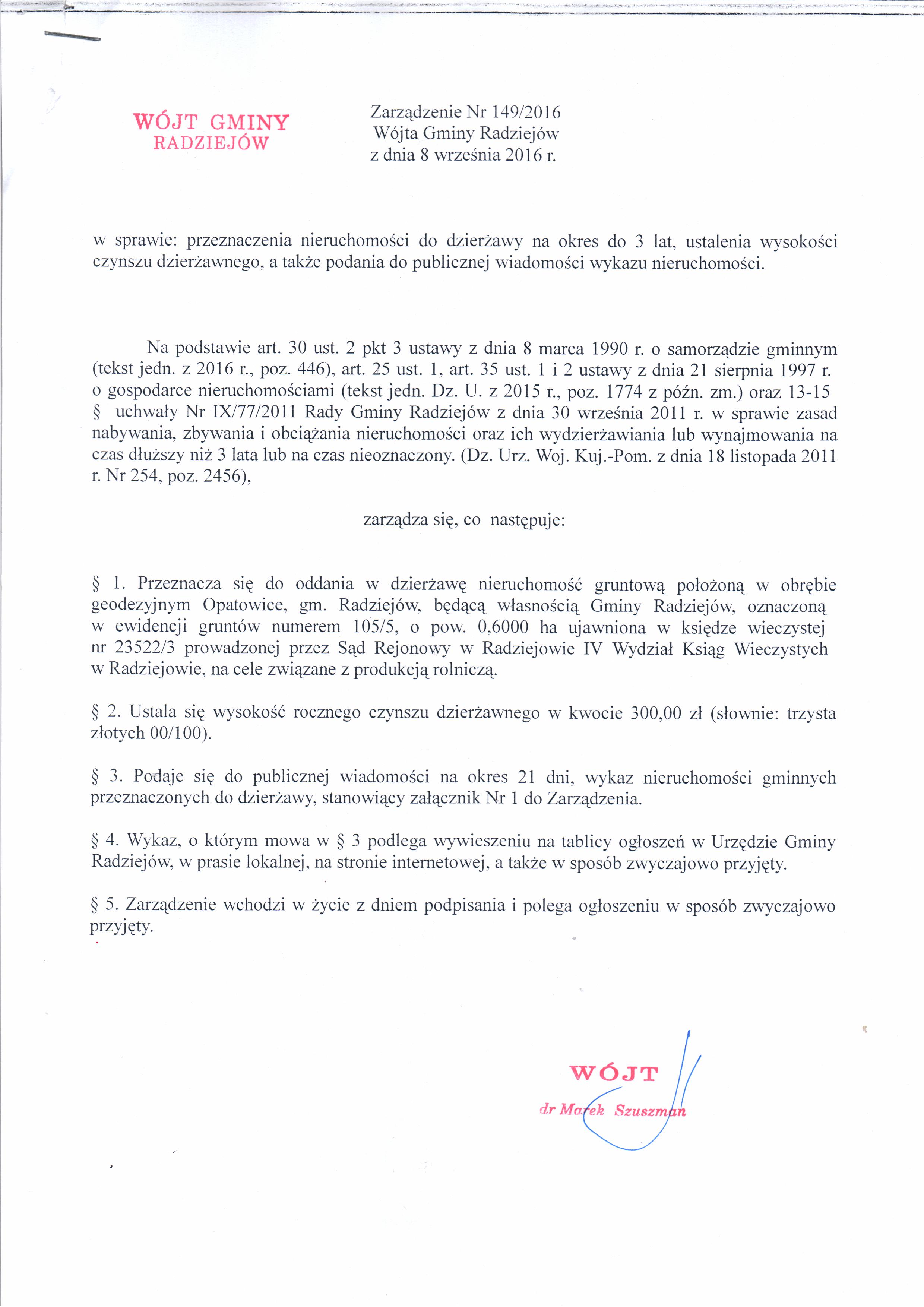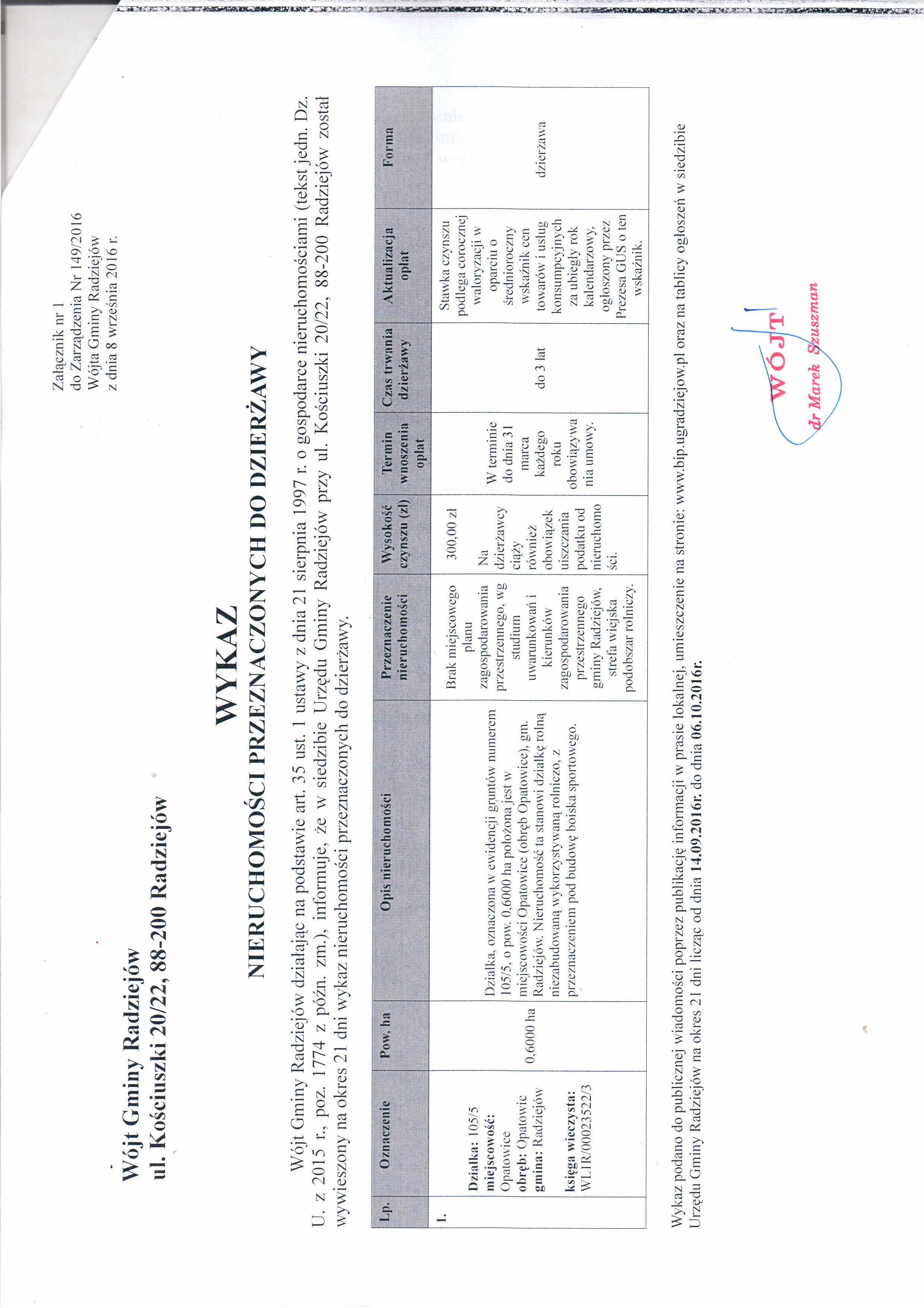 Wykaz nieruchomo艣ci przeznaczonych do dzier偶awy na okres do 3 lat, tj. dzia艂ka nr 105/5, obr臋b Opatowice, gm. Radziej贸w.